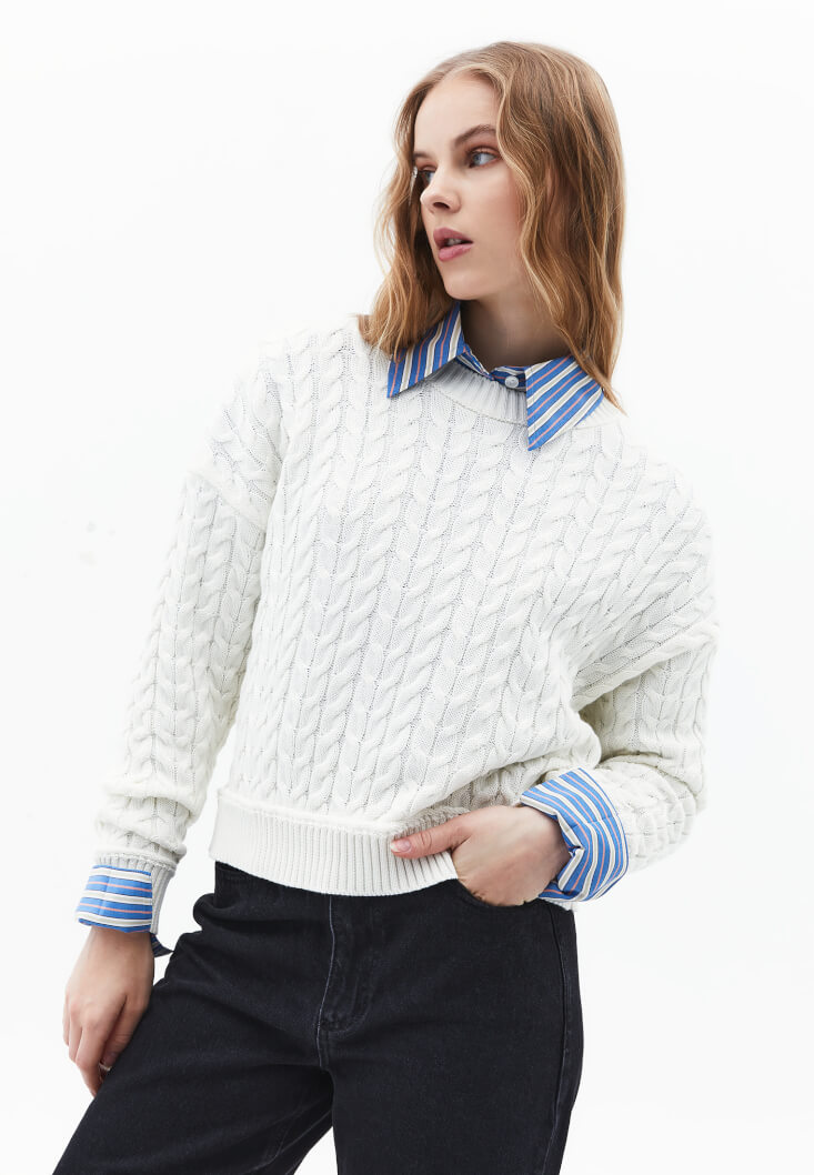 Siyahın o asil ve keskin duruşunu Ultra Yüksek Bel Mom Fit Pantolon ile vurgulayıp, üzerine bulutlar kadar yumuşak Bot Yaka Triko Kazak giydiğinde oluşan o sıcak kontrastı çok seveceksin. Bu saç örgüsü detaylı kazak, seni hem kışın dondurucu soğuğundan koruyacak hem de çocukluğundaki o huzurlu kış anılarına götürecek. Krem renginin saflığı ve siyahın gücü, gün boyu üzerinde taşıyacağın bir zarafet zırhı gibi olacak.