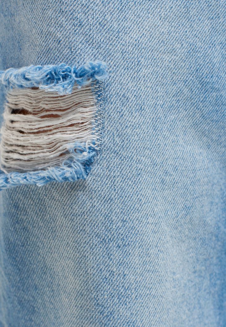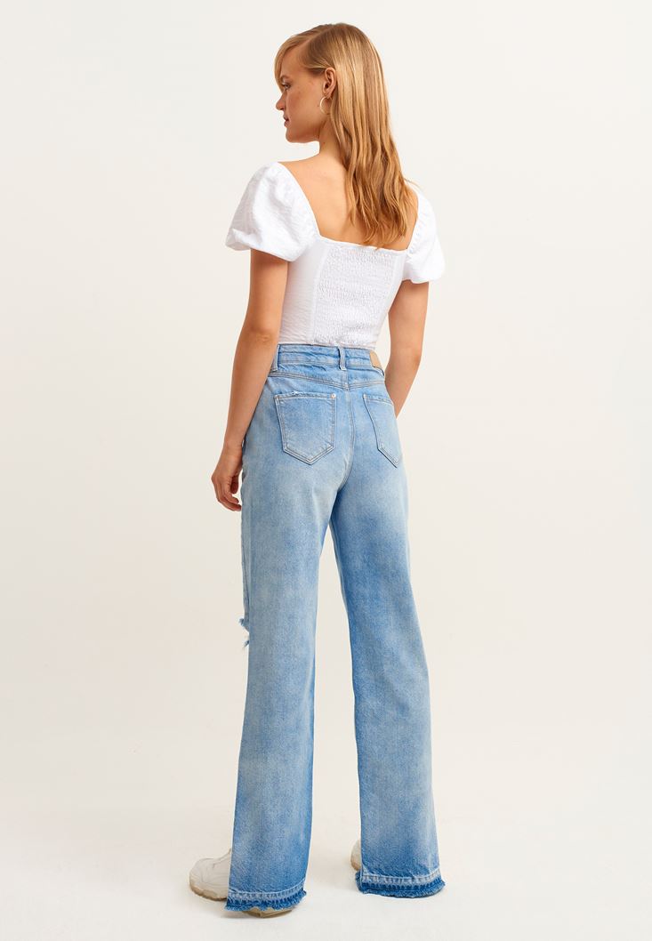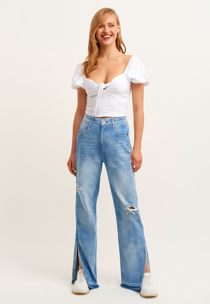 %100 pamuklu denim doku, ultra yüksek bel, bol paça, ön kısmı yırtık detaylı, iki paçası da yırtmaçlı, bedenden uzak rahat kalıp.