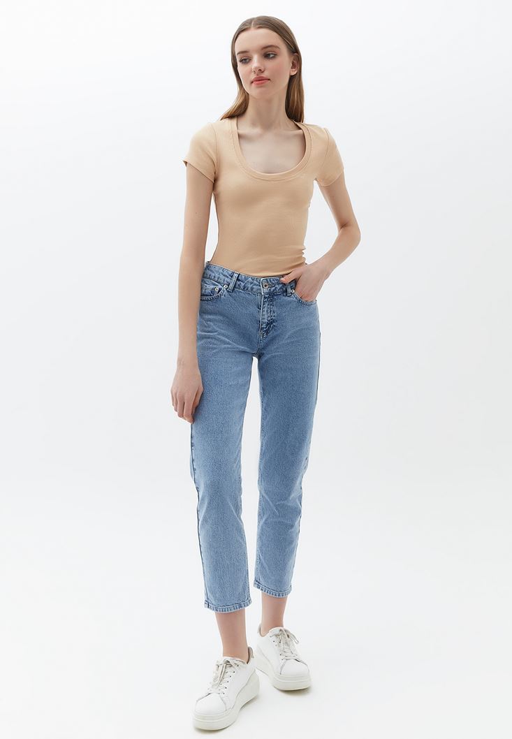 U Yaka Basic Tişört ve Mom-Fit Pantolon Kombini