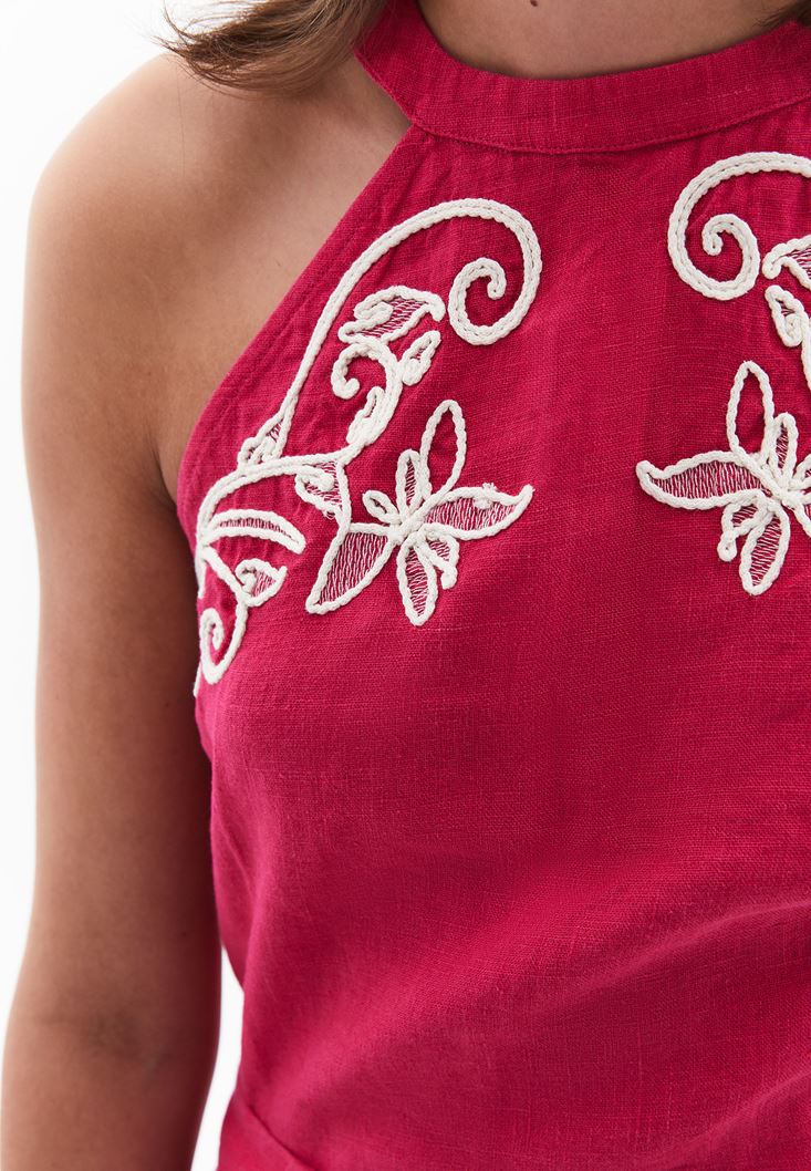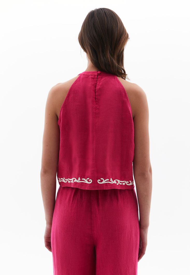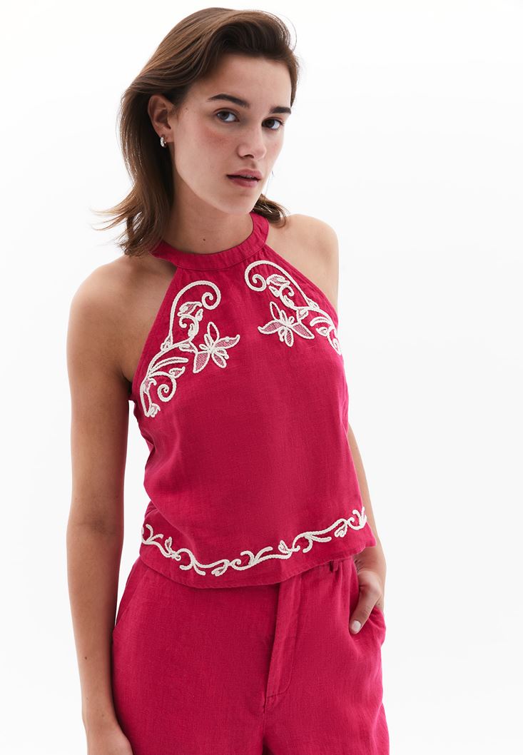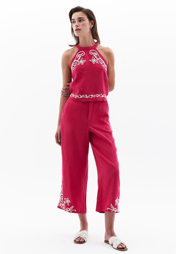 Halter Yaka Bluz ve Keten Pantolon Kombini