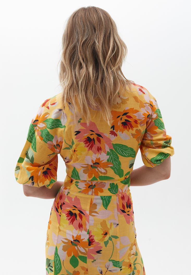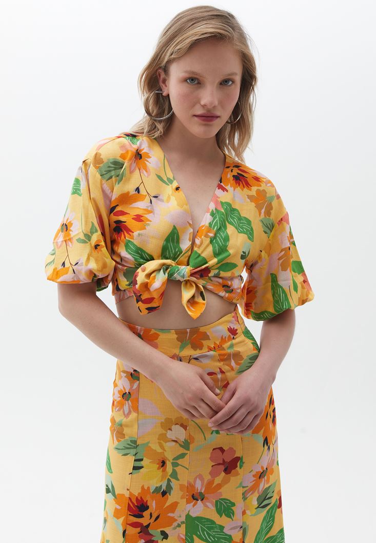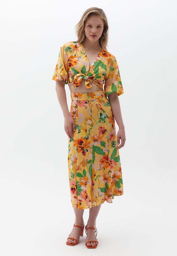 Desenli Balon Kollu Gömlek ve Etek Kombini