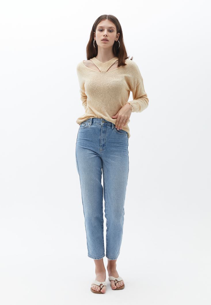 Cut-Out Detaylı Triko ve Mom Pantolon Kombini