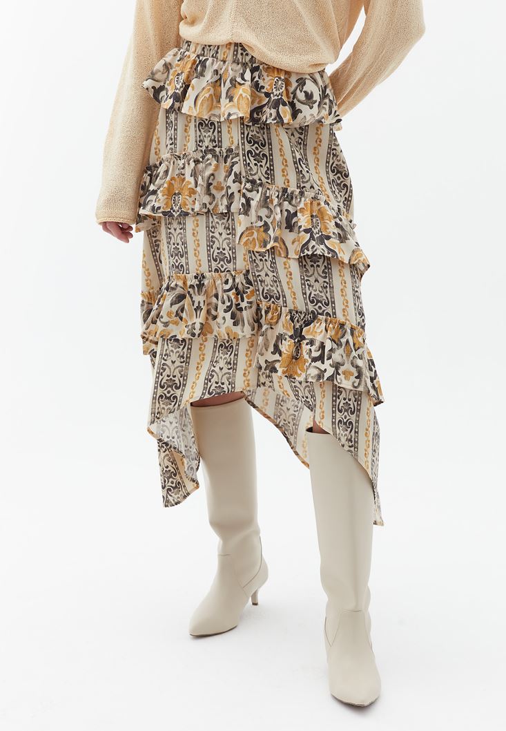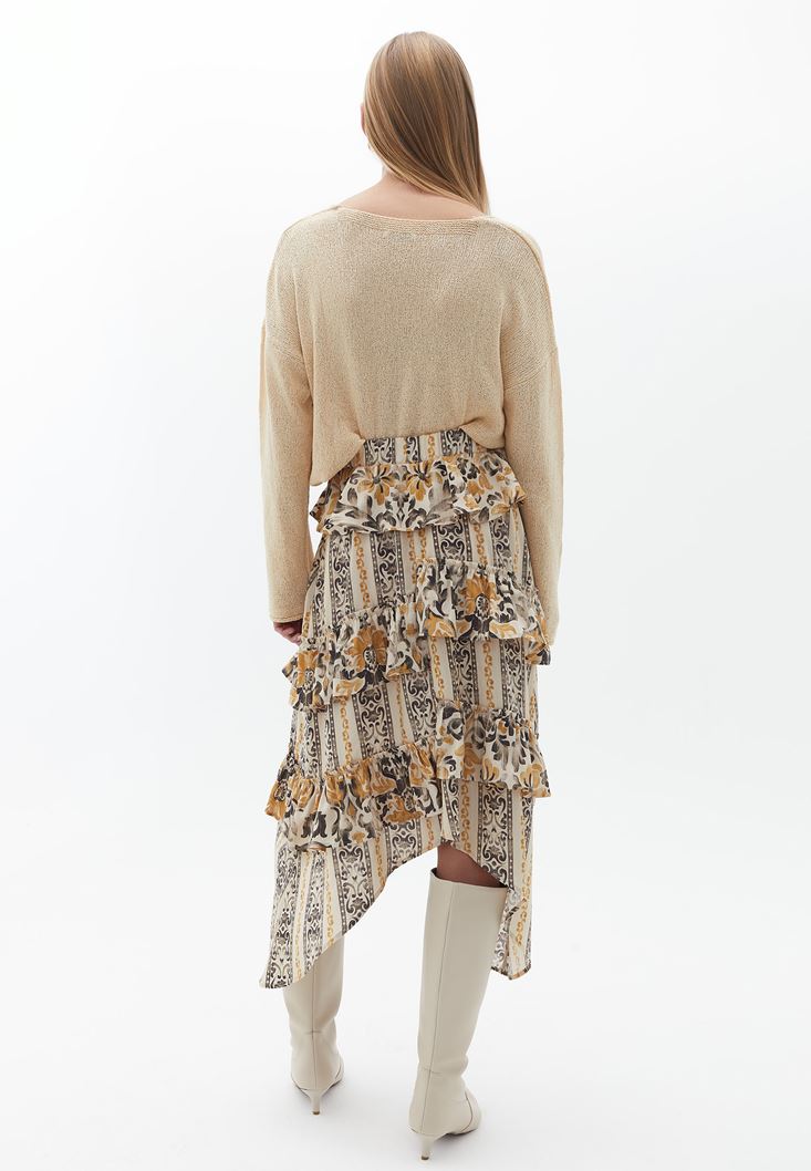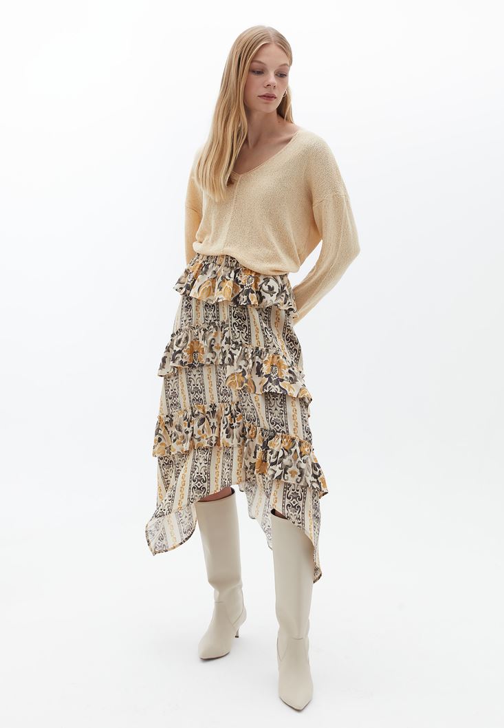Fırfırlı Midi Etek ve V Yaka Kazak Kombini