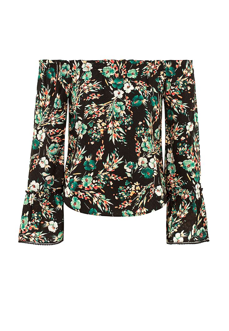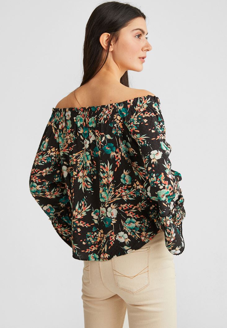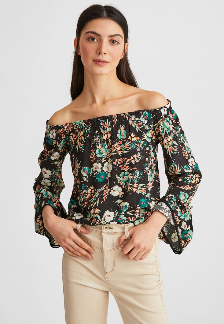 Siyah Açık Omuzlu Çiçek Desenli Bluz