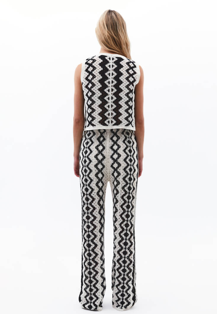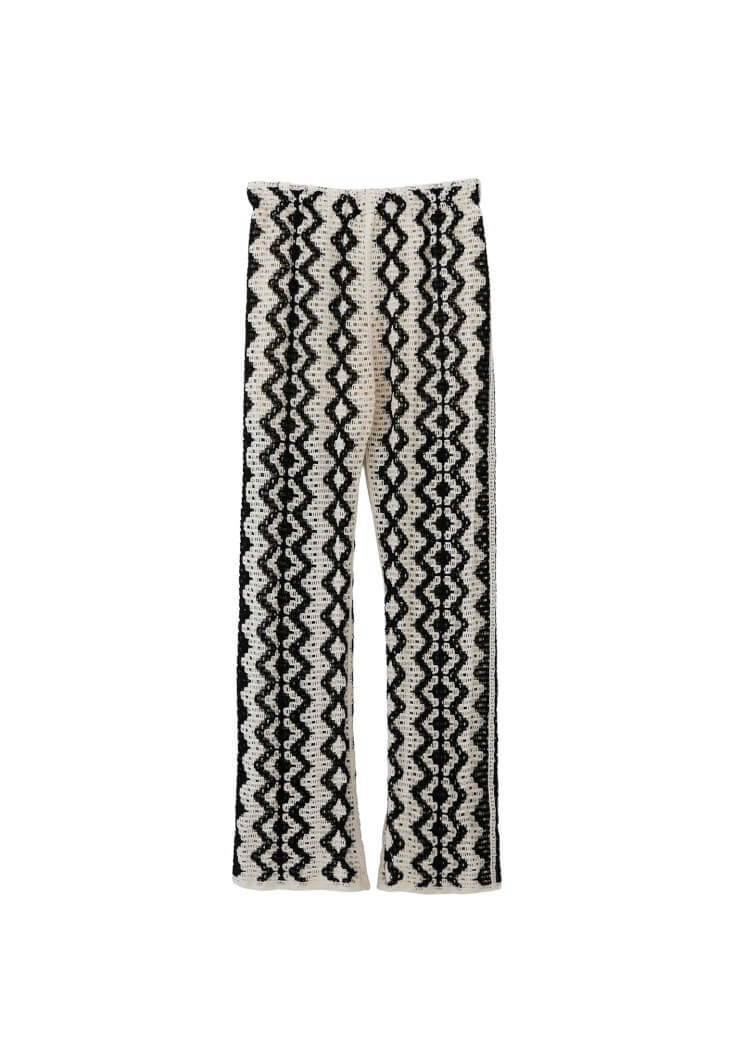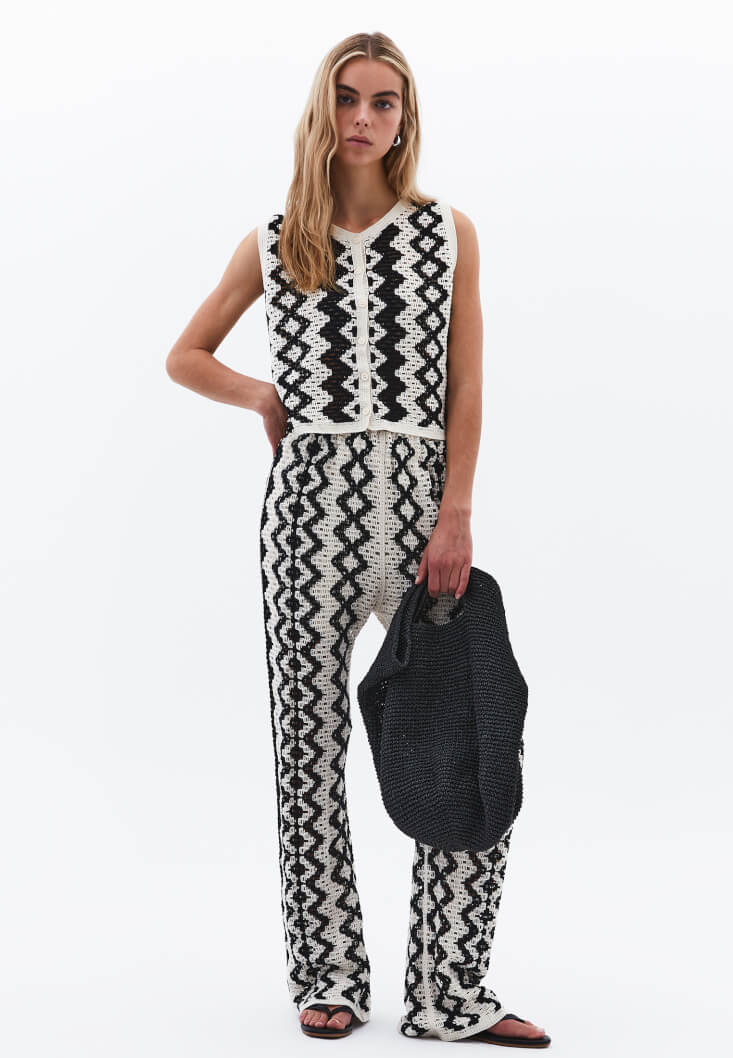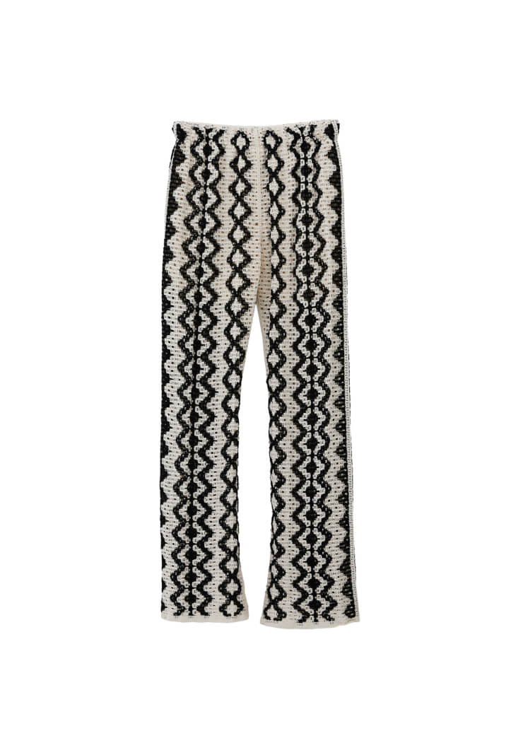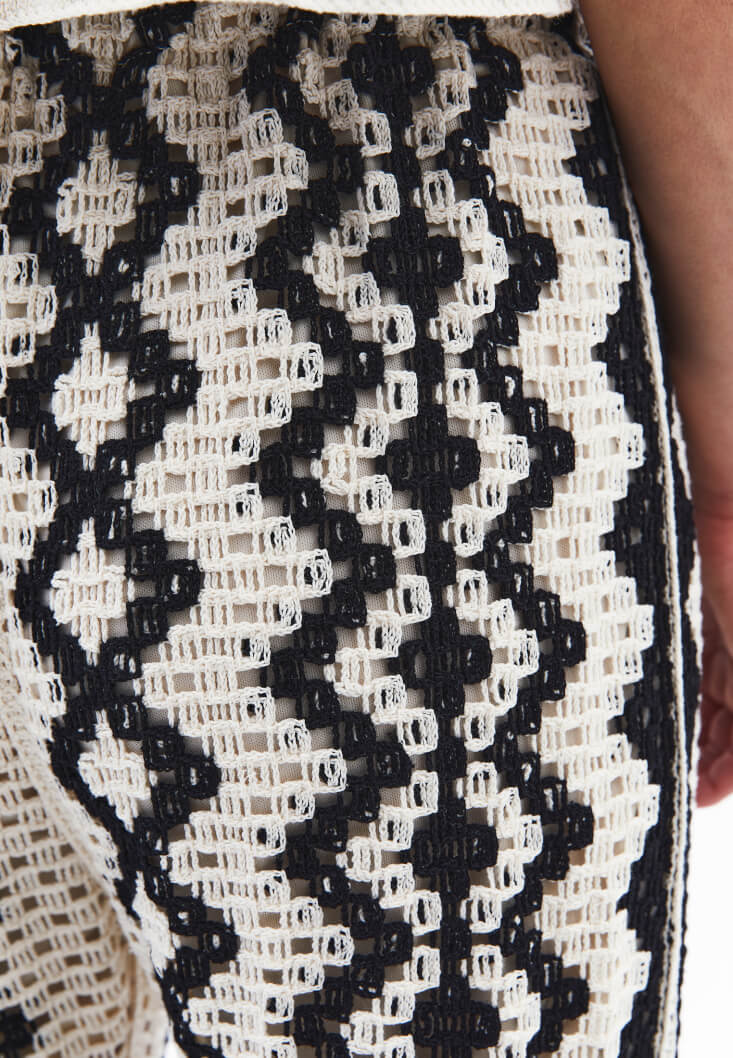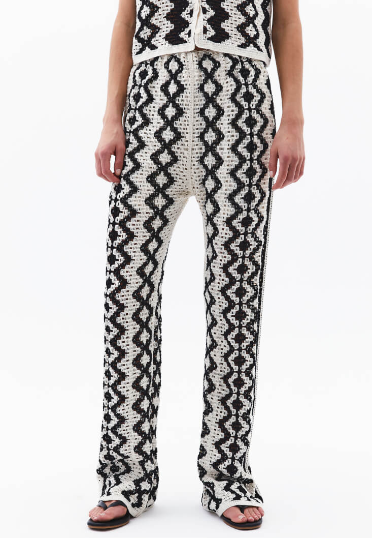 Ajurlu örgü dokusuyla dikkat çeken bu pantolon, feminen detayları ve modern kesimi bir araya getiriyor. Yüksek bel formu bel hattınızı vurgularken, bedene hafif oturan yapısı ve paçalara doğru genişleyen kesimiyle zarif bir siluet sunuyor.