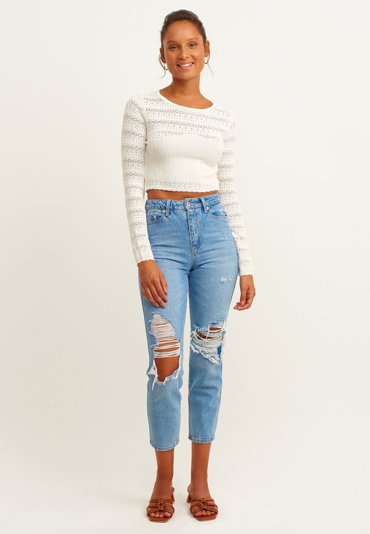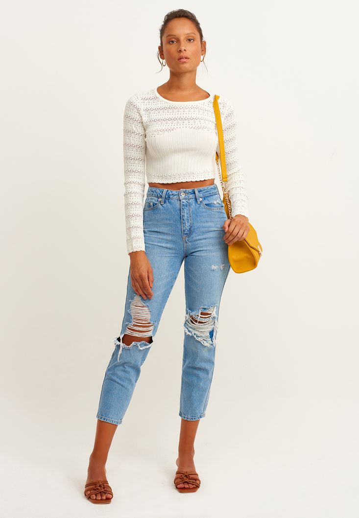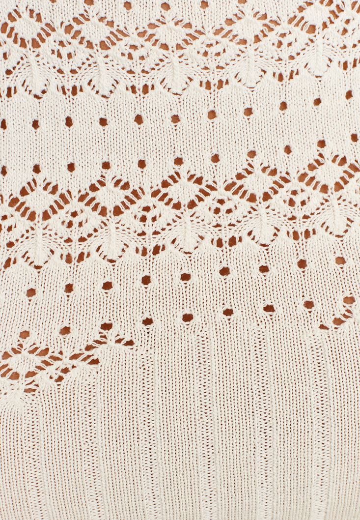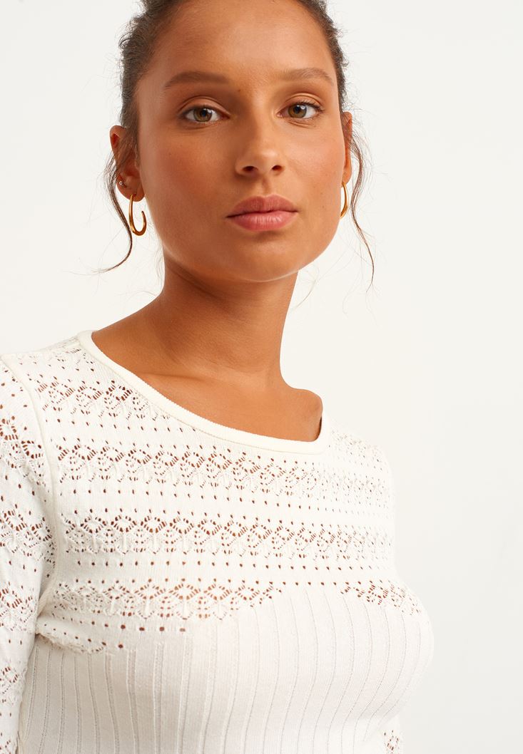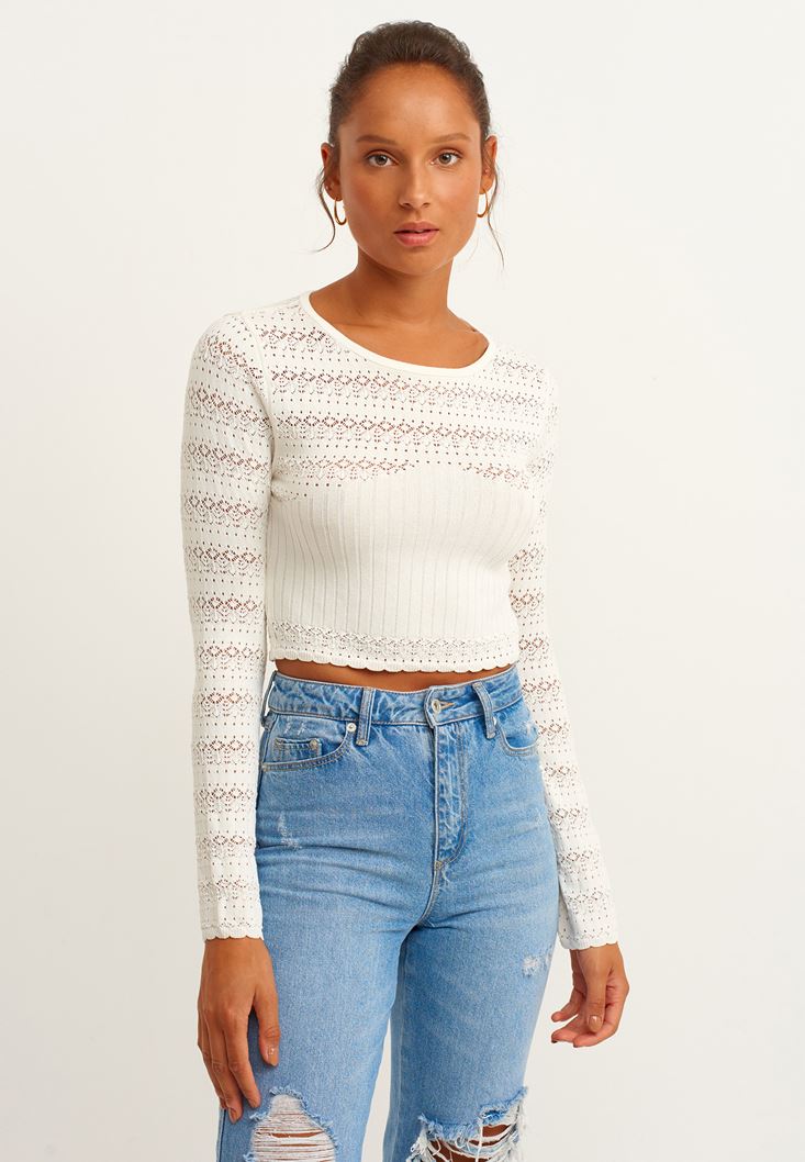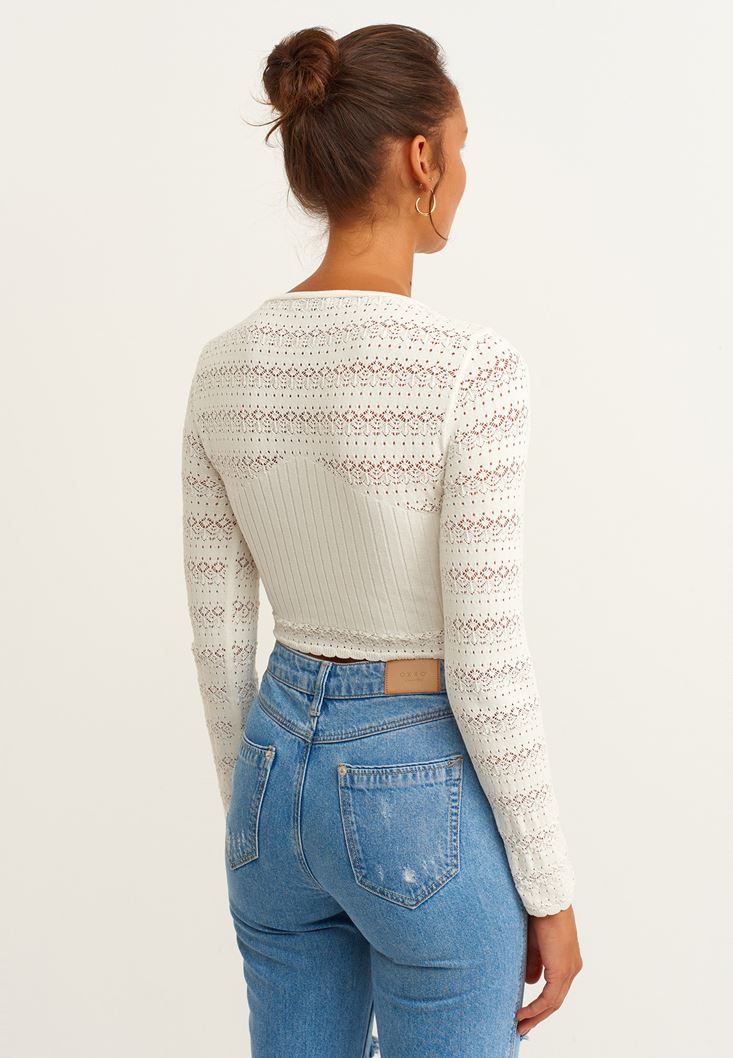 Viskon karışımlı triko, ajurlu örme, sıfır yaka, uzun kollu, crop kesim, bedeni saran rahat kalıp.