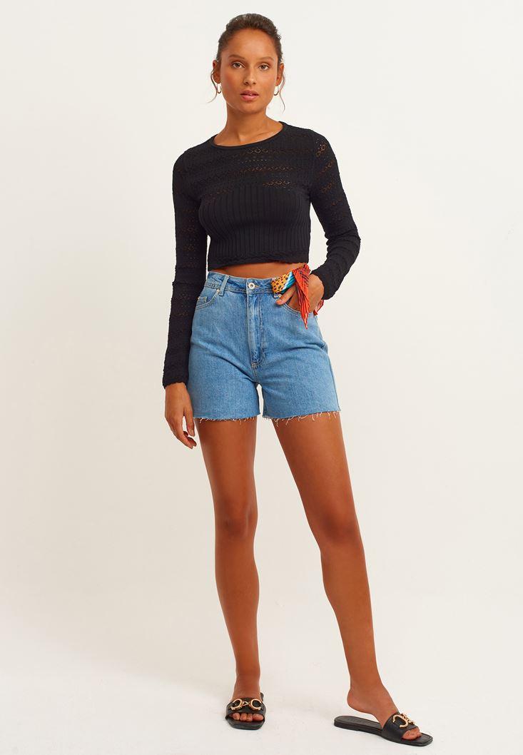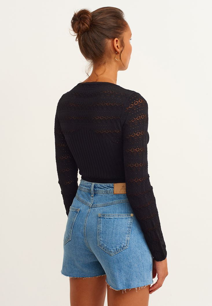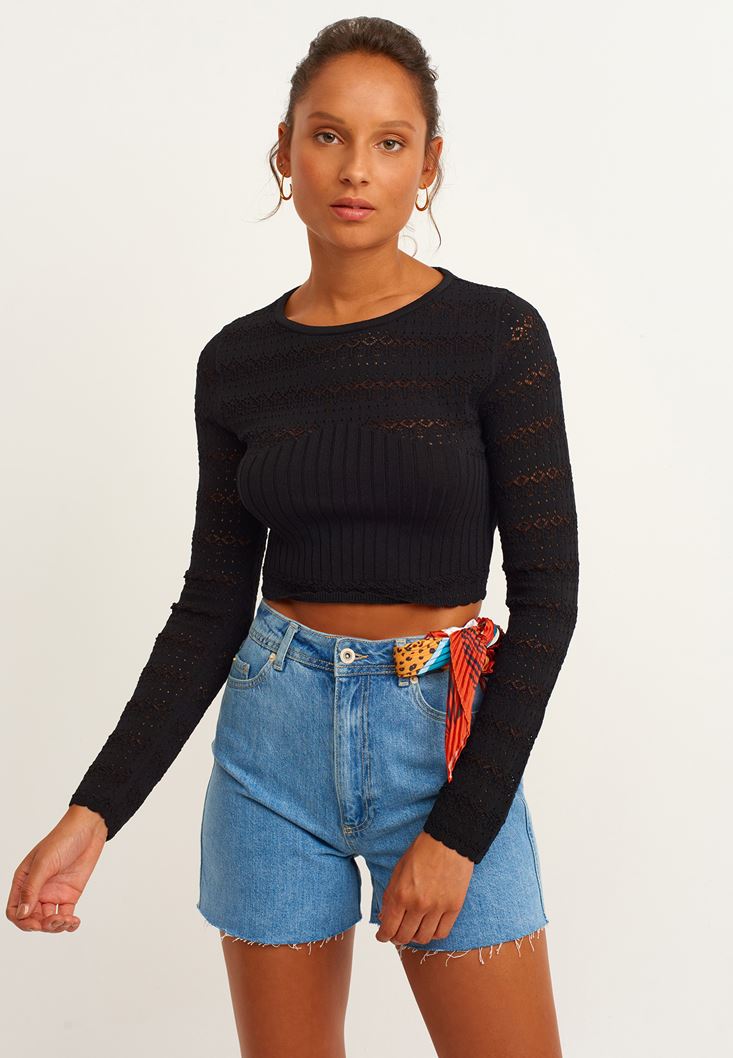 Viskon karışımlı triko, ajurlu örme, sıfır yaka, uzun kollu, crop kesim, bedeni saran rahat kalıp.