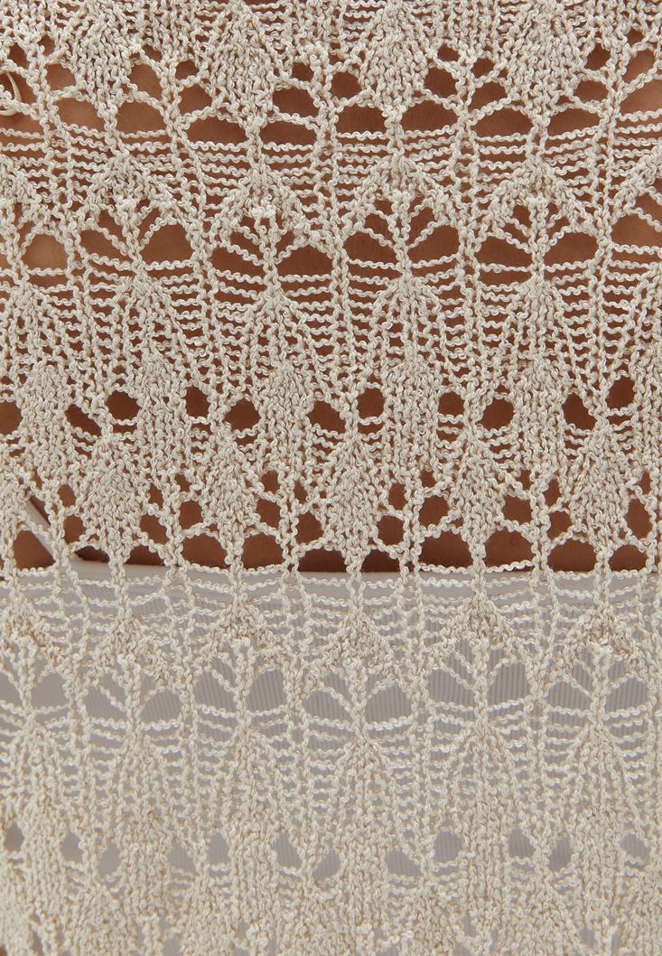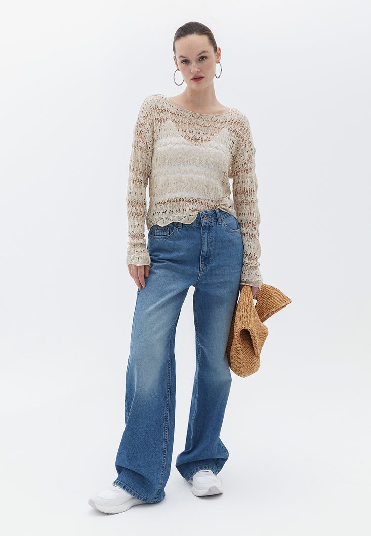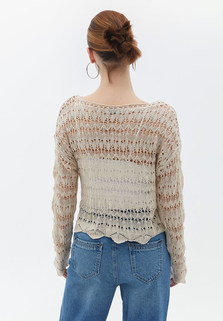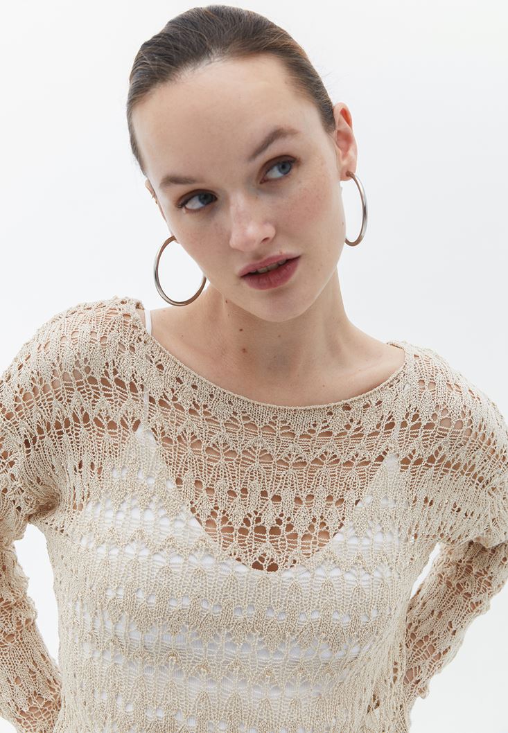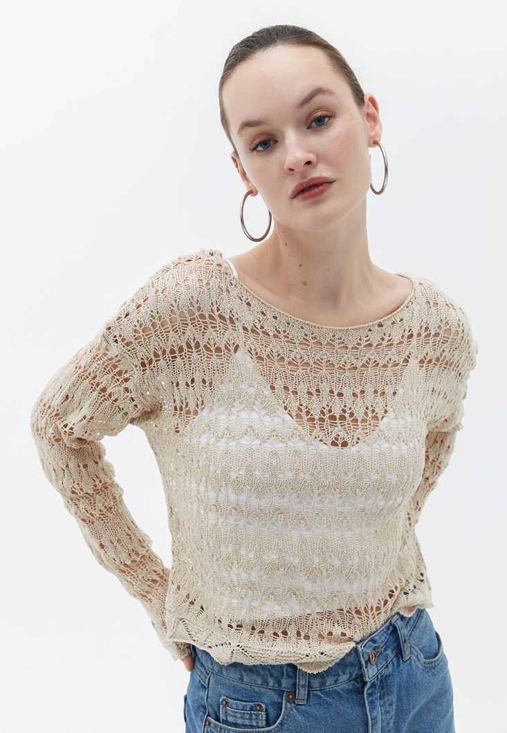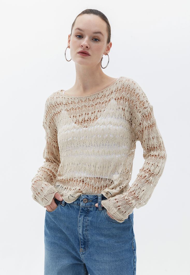 Ajurlu örgü, bedenden uzak rahat fit, uzun kollu, bot yaka, crop kesim.