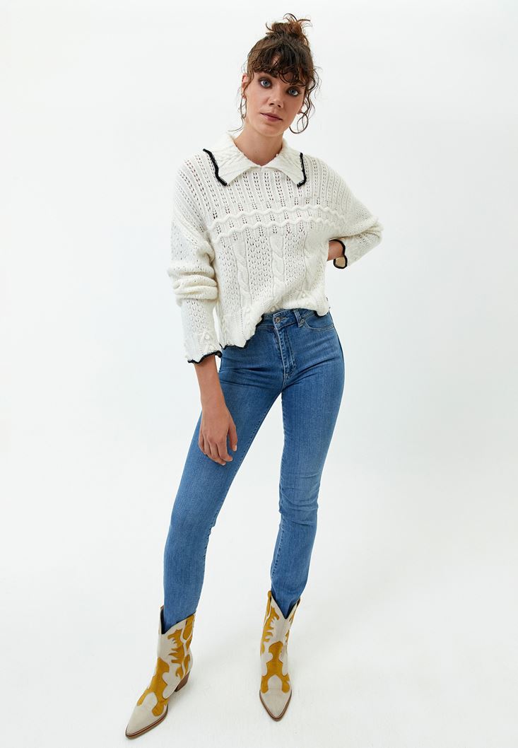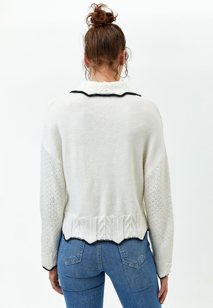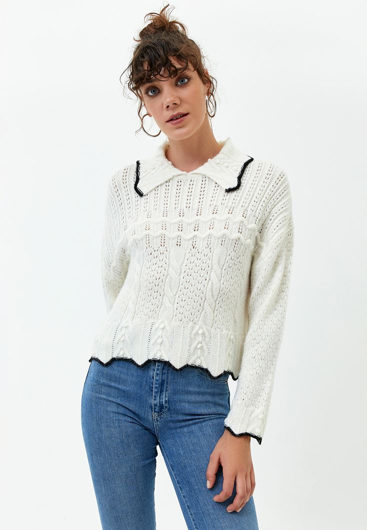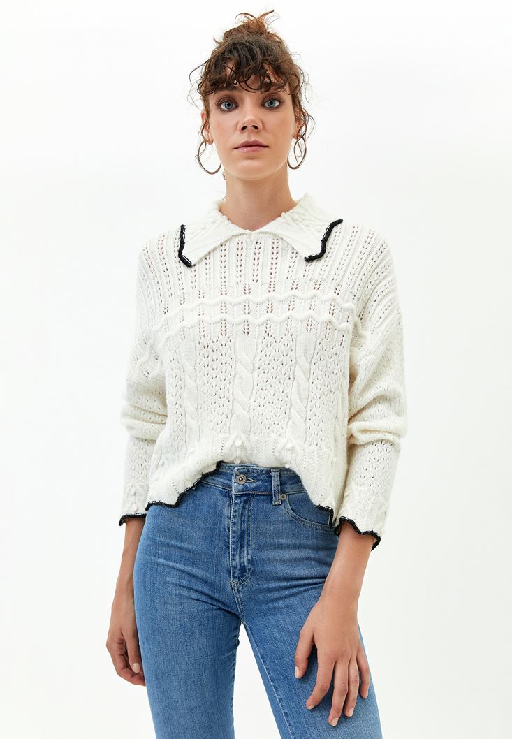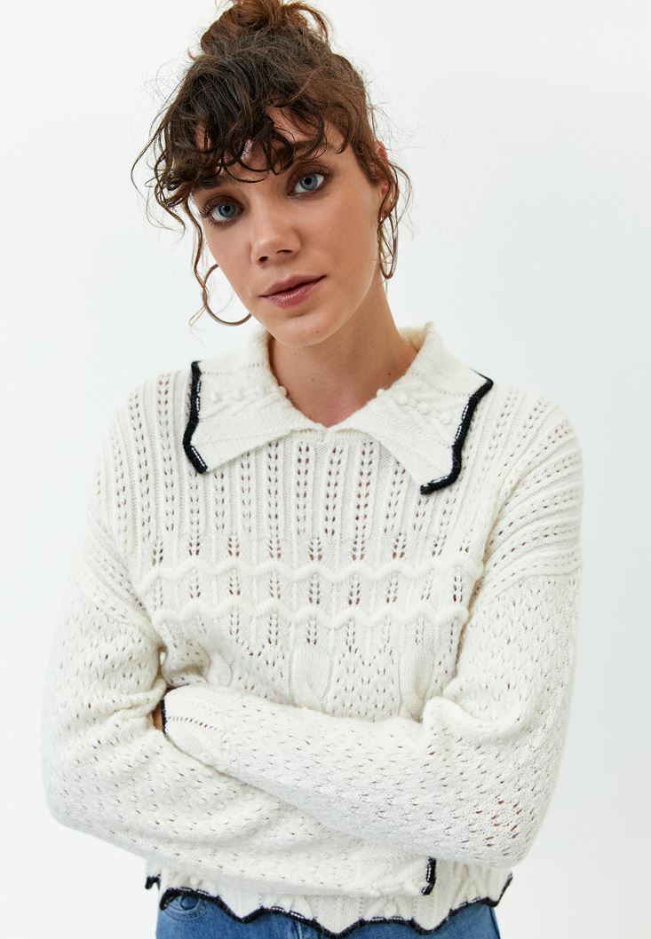• Bayan Krem Ajurlu Polo Yaka Triko