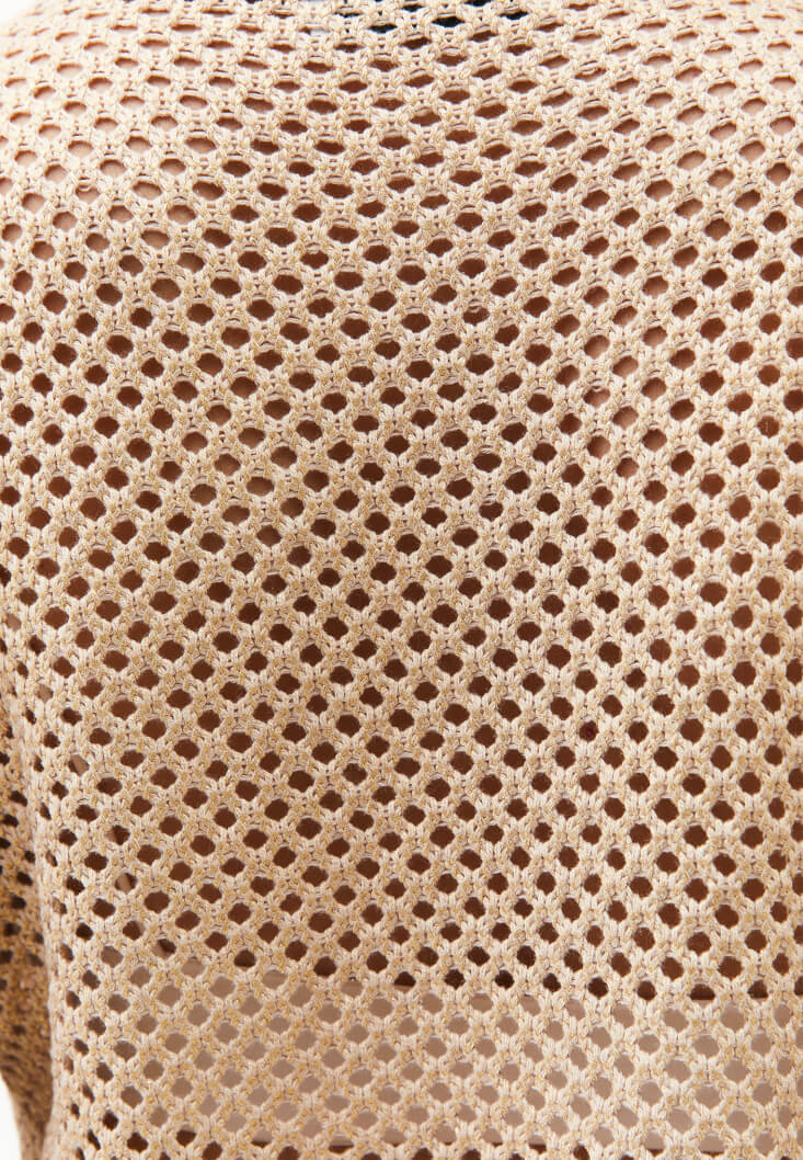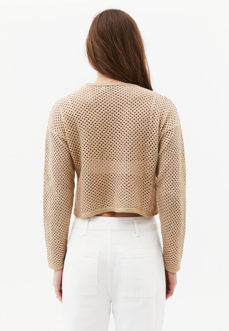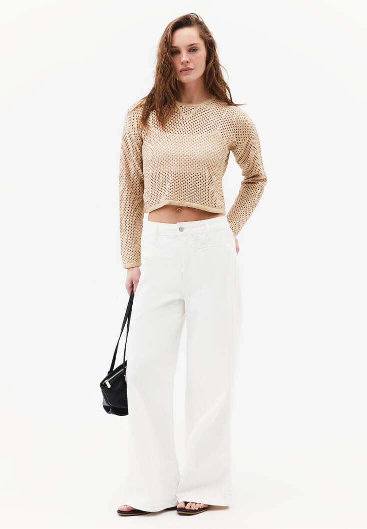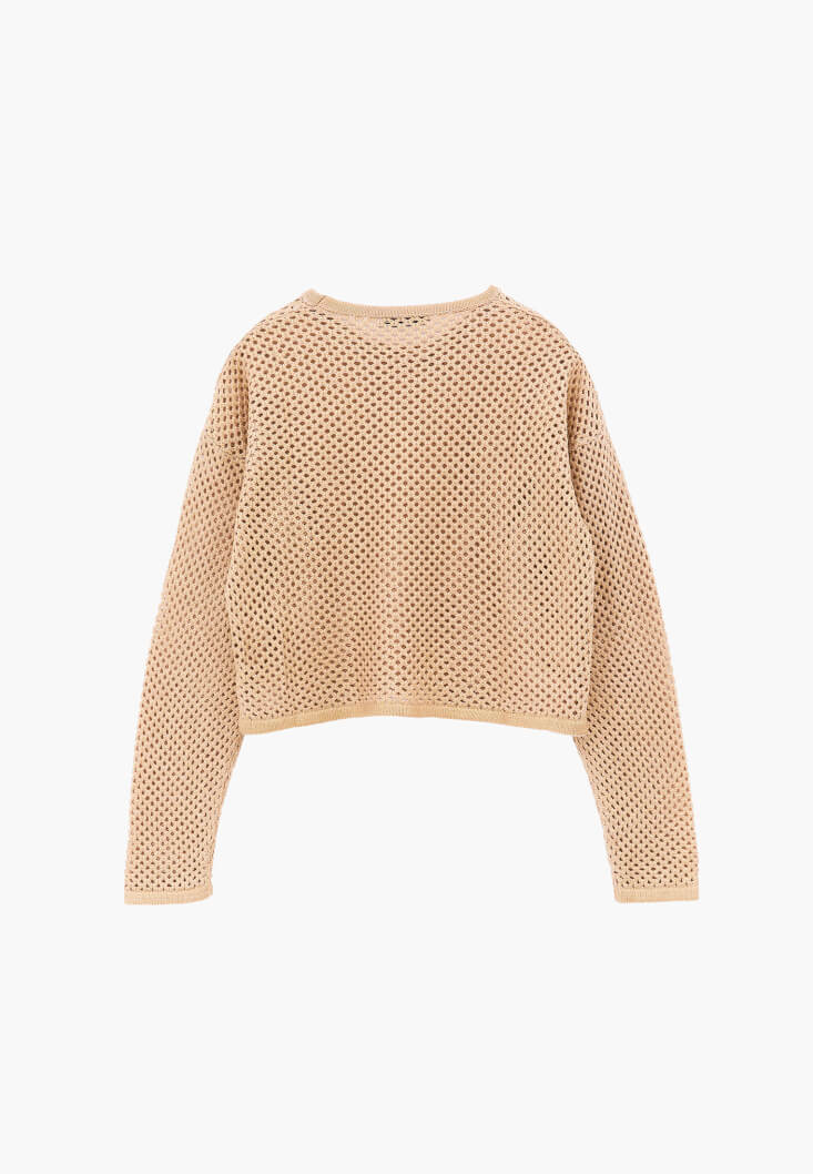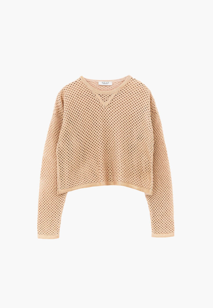 Pamuk karışımlı doku, ajurlu örgü, sıfır yaka, uzun kollu, crop kesim, bedenden uzak rahat fit.