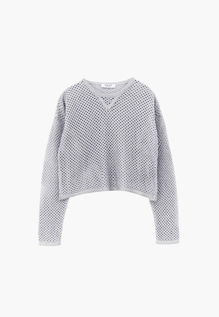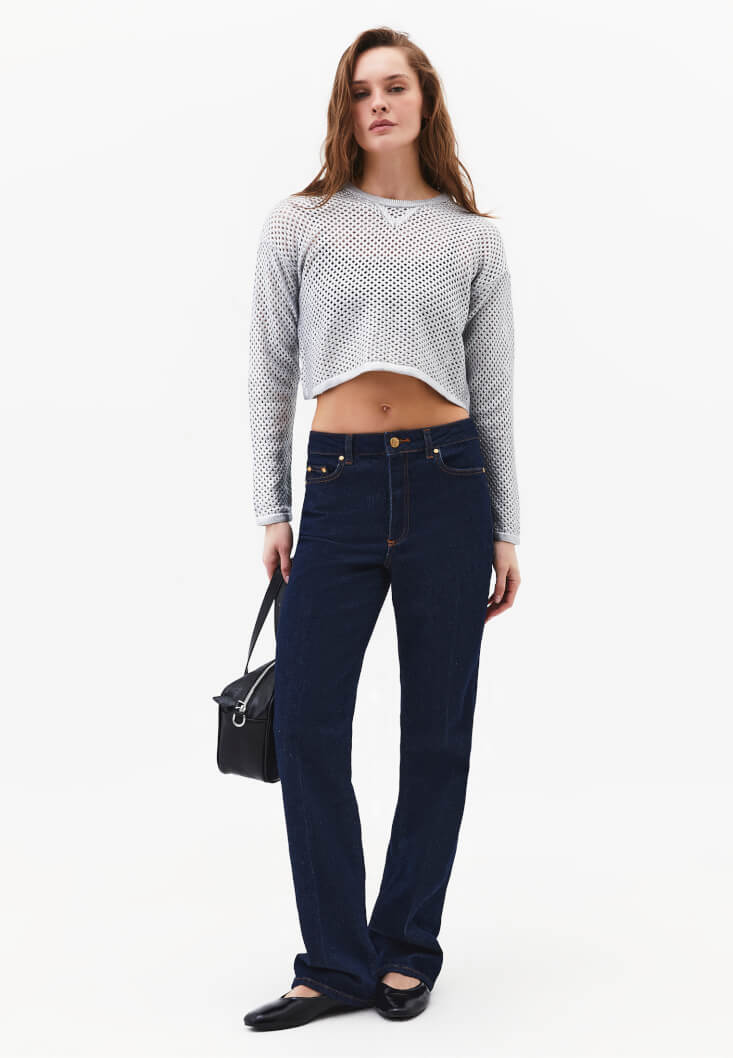 Pamuk karışımlı doku, ajurlu örgü, sıfır yaka, uzun kollu, crop kesim, bedenden uzak rahat fit.