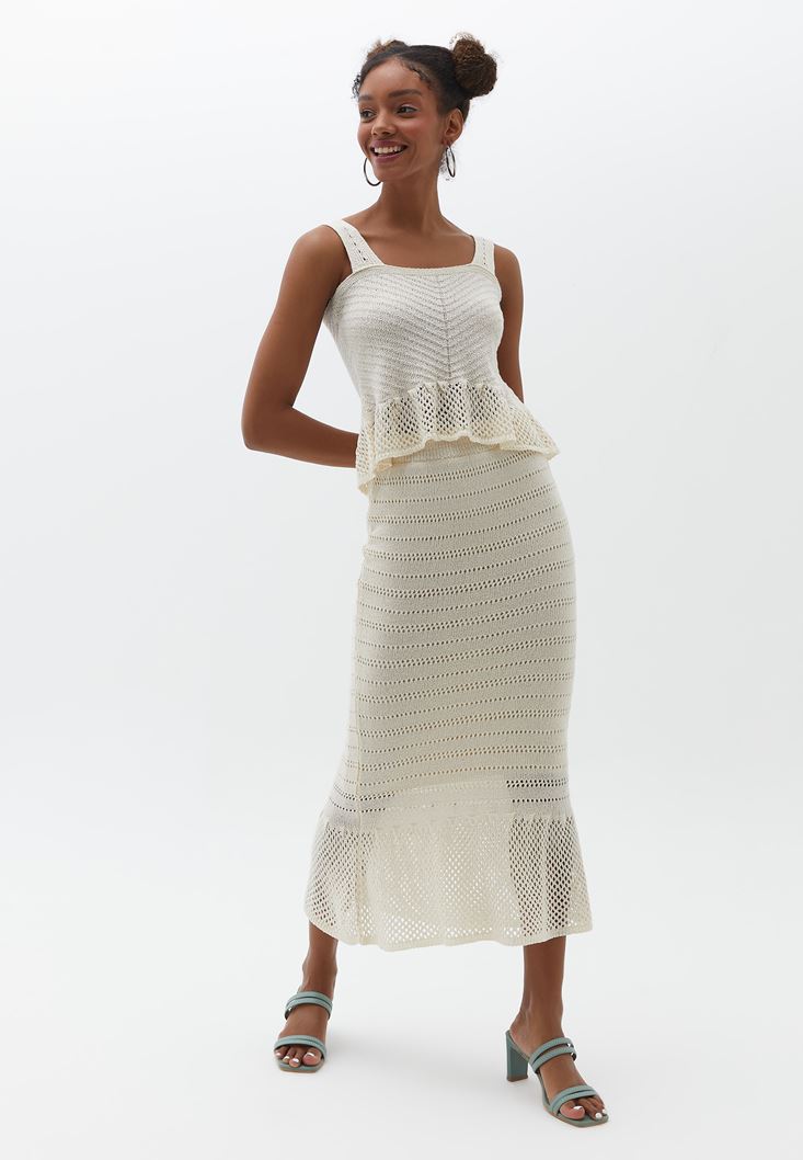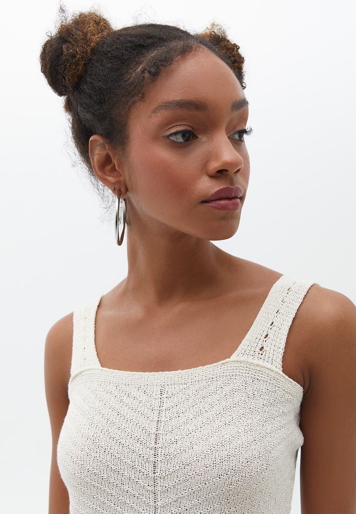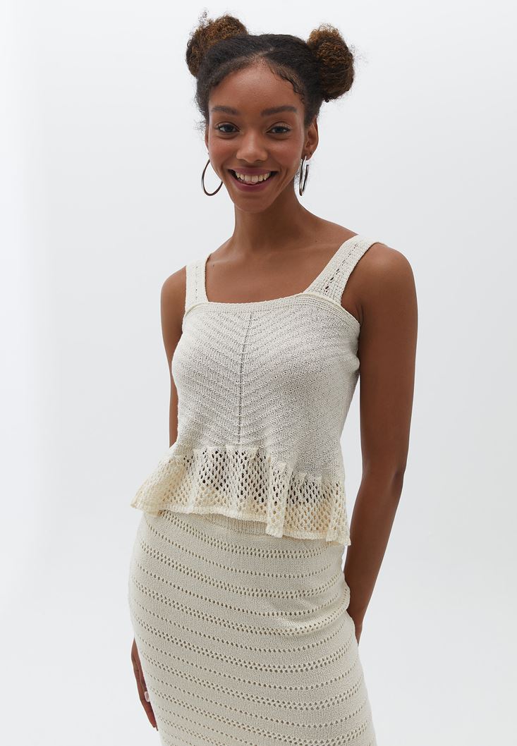 Özel triko örgü, kare yaka, kalın askılı, bel kısmı volanlı, bedeni saran fit, sırt kısmı kare kesim.