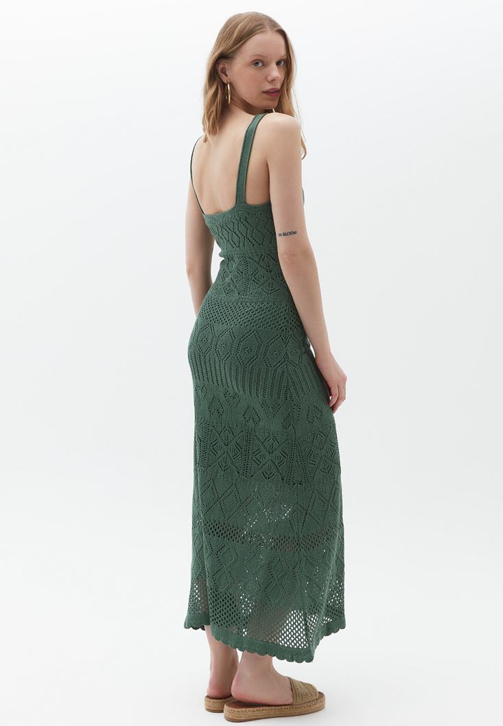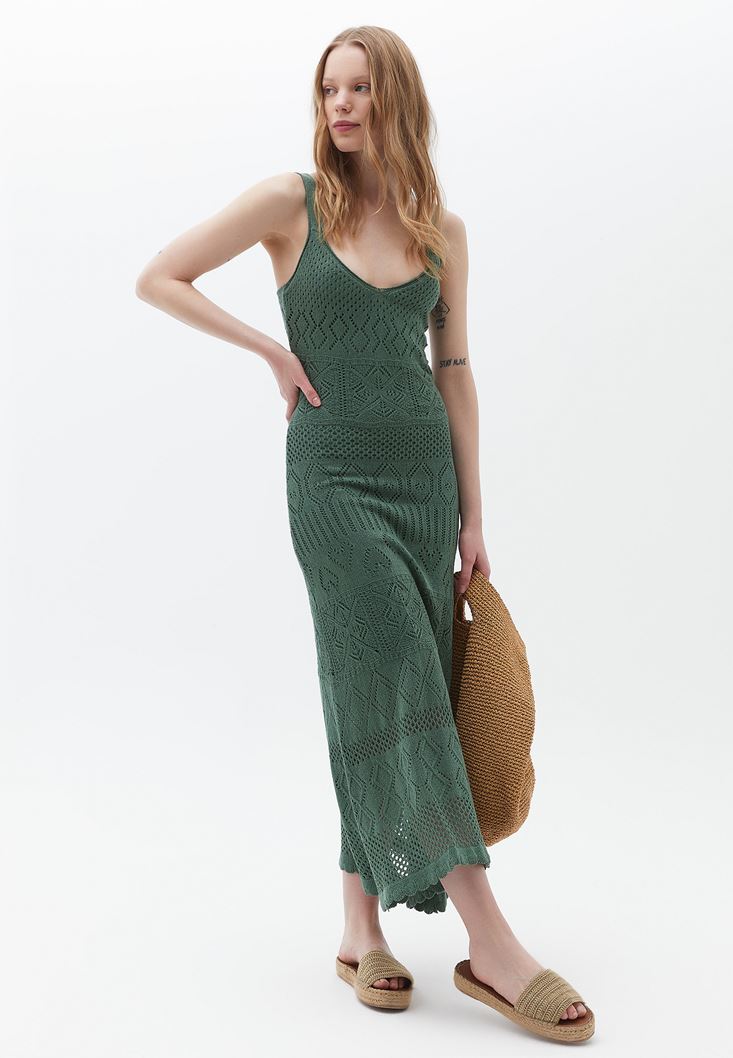 Ajurlu triko örgü, v yaka, kalın askılı, bedene yakın fit, maxi boy.
