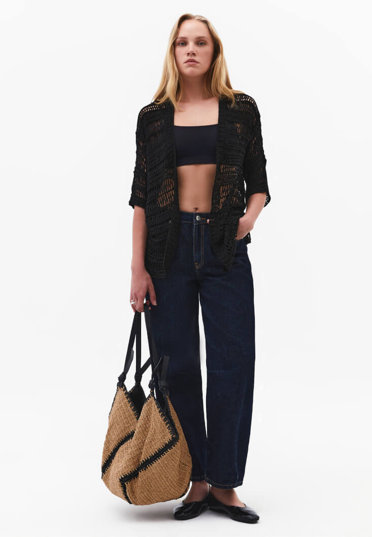 Bu karakteristik parçayı, alt grupta yapısal bir asalet sergileyen ultra yüksek bel straight-fit pantolonlar veya dökümlü modal wide-leg tasarımlarla eşleştirerek dokular arası şık bir kontrast yakalayabilirsiniz. Görünümünüze modern bir vurgu eklemek isterseniz, içine dantel detaylı romantik bir atlet giyerek ajur dokusunun transparan etkisini stilize edin. Ayakkabı seçiminde sivri burunlu babetler veya minimalist deri sandaletlerle zarafeti mühürlerken; aksesuar tercihinde burgu detaylı küpeler ve çoklu zincir kolyelerle bu rafine tavrı tamamlayın. Hem serin yaz akşamlarında hem de mevsim geçişlerinin rafine buluşmalarında yanınızdan ayırmak istemeyeceğiniz bu hırka, OXXO kadınının özgür ve sanatsal ruhunu temsil ediyor.