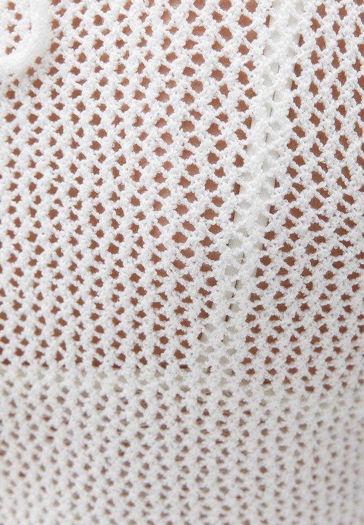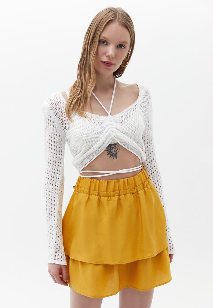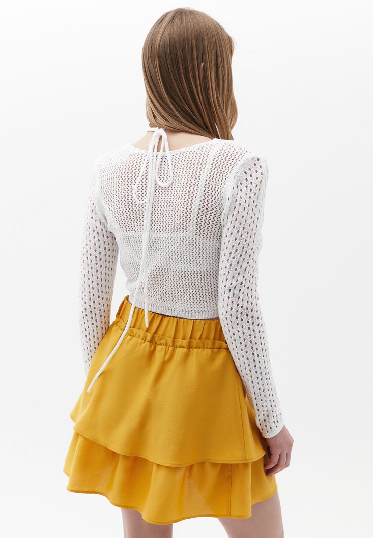 Ajurlu örgü triko, v yaka, ön kısmı büzgü detaylı, boyun ve bel kısmı bağcıklı, uzun kollu, bedeni saran fit, crop kesim.