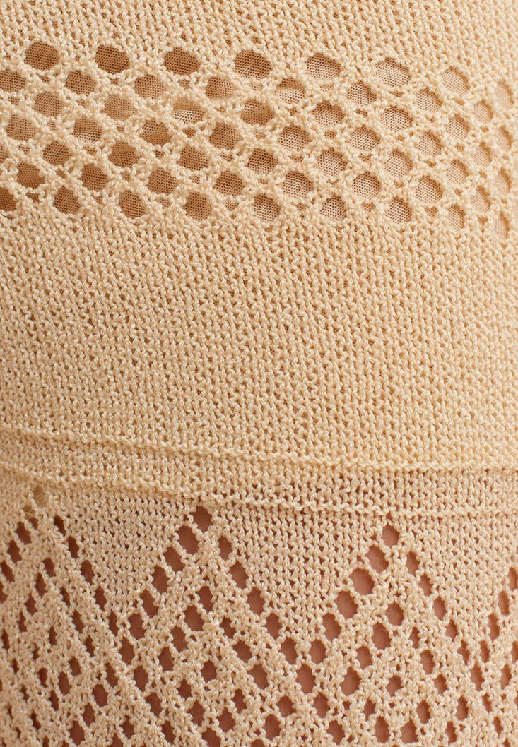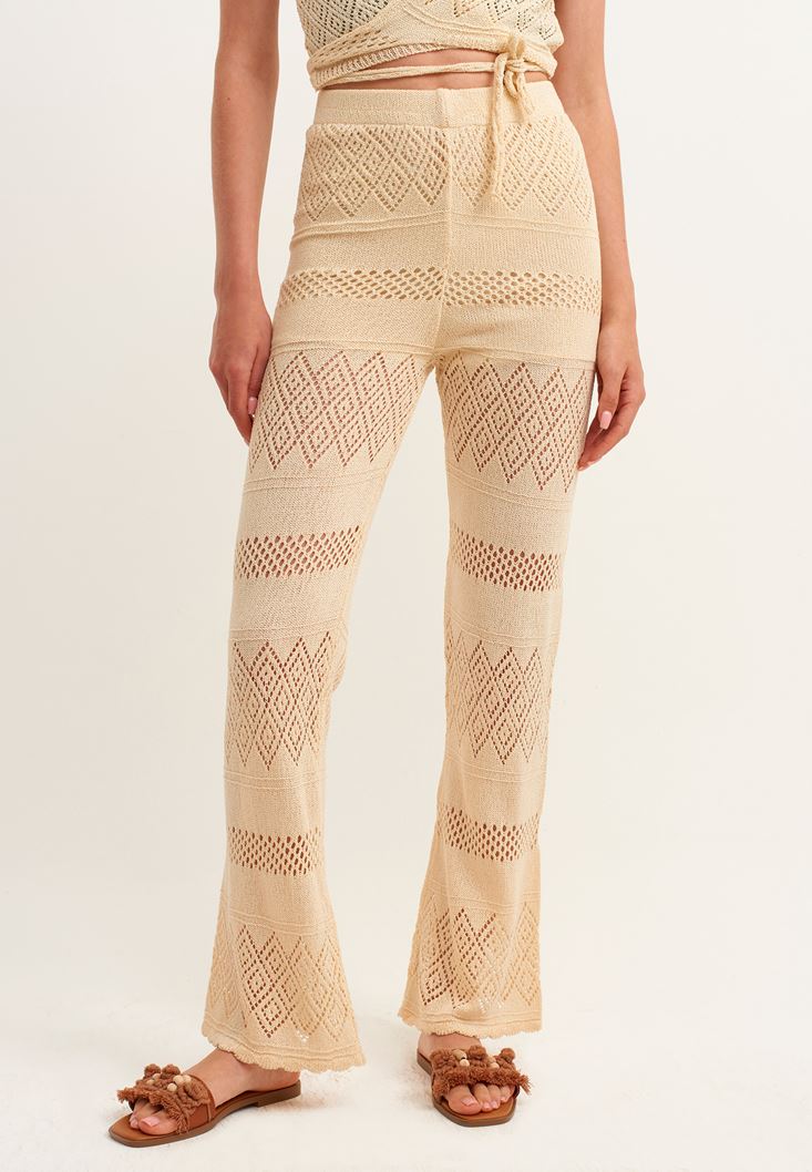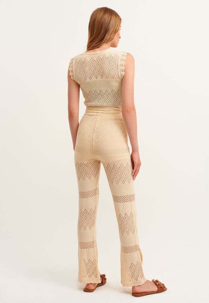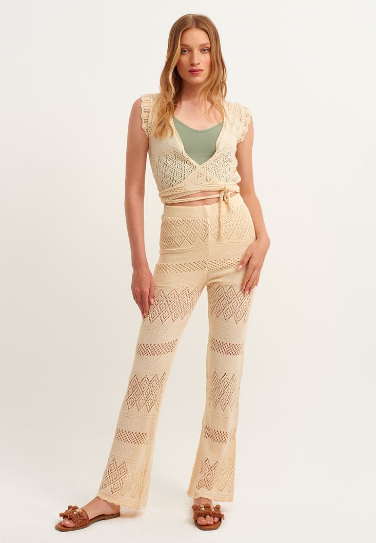 Ajurlu örme triko, beli lastikli ve ultra yüksek bel, şort formlu astar, flare paça, beden boyunca ajurlu motif detayı.