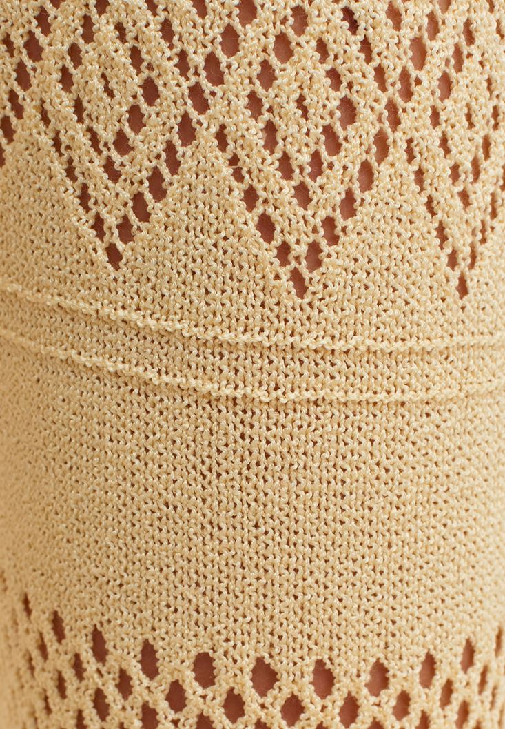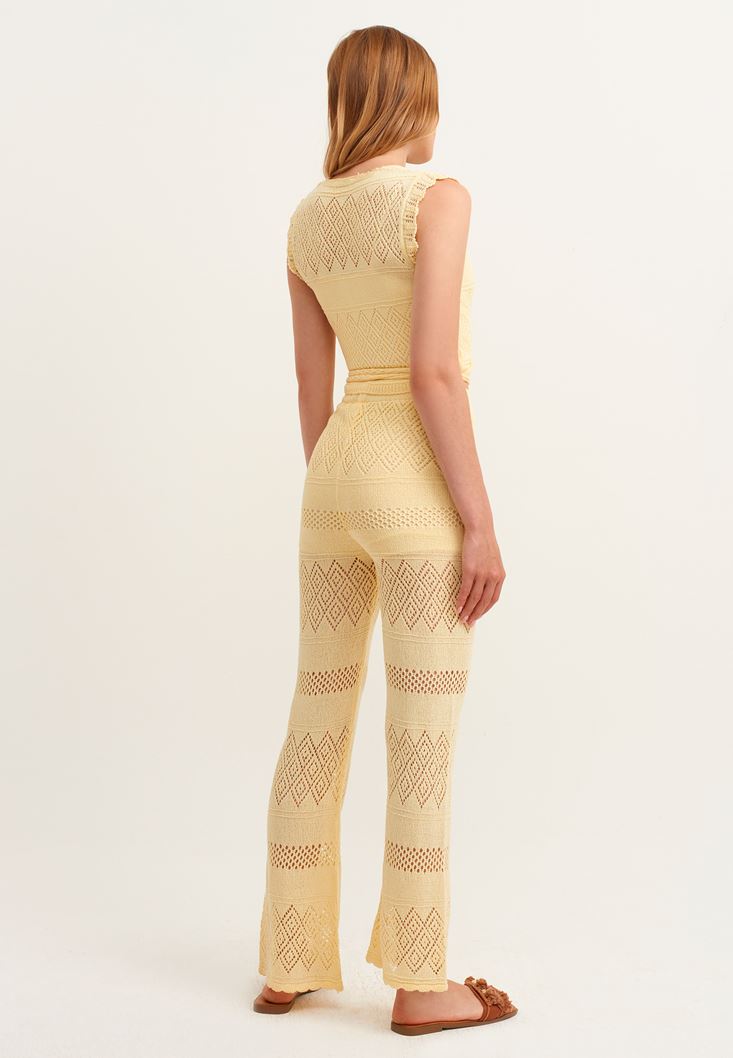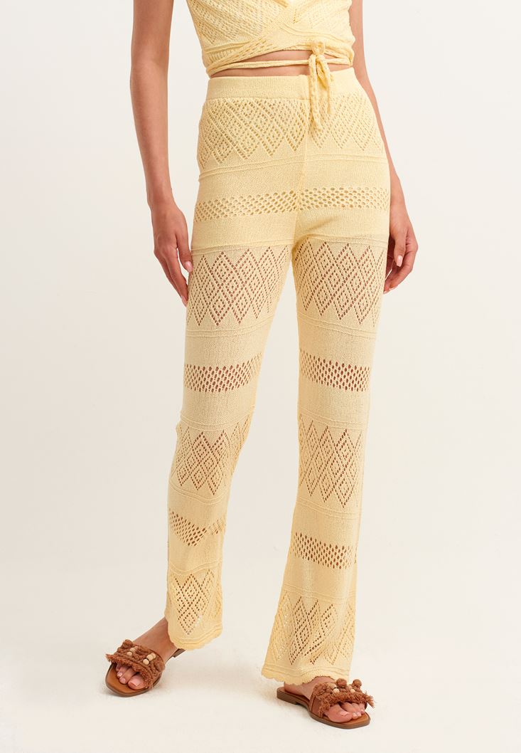 Ajurlu örme triko, beli lastikli ve ultra yüksek bel, şort formlu astar, flare paça, beden boyunca ajurlu motif detayı.