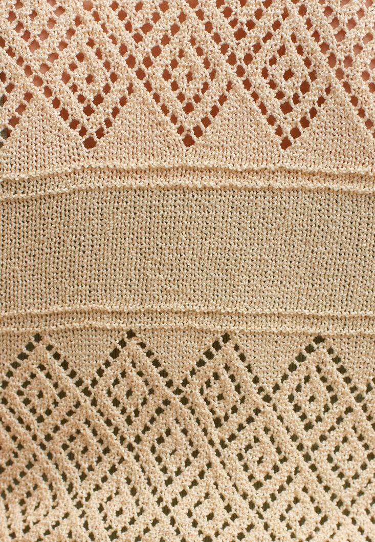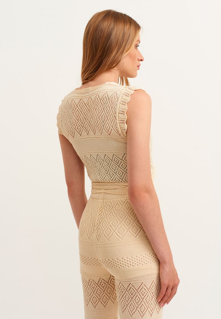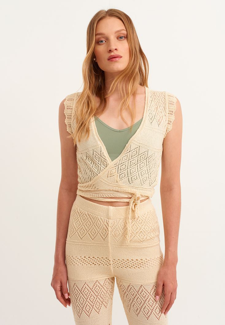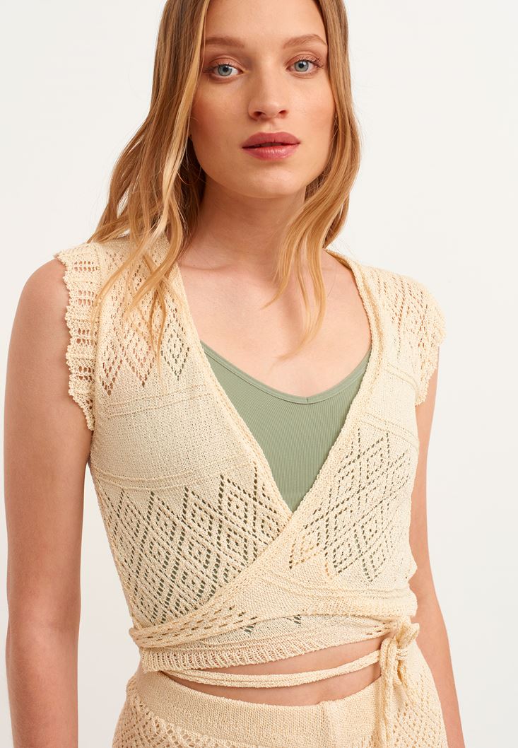 Ajurlu örgü, belden bağlama detaylı, kruvaze yaka, bedeni saran rahat kalıp, crop kesim.