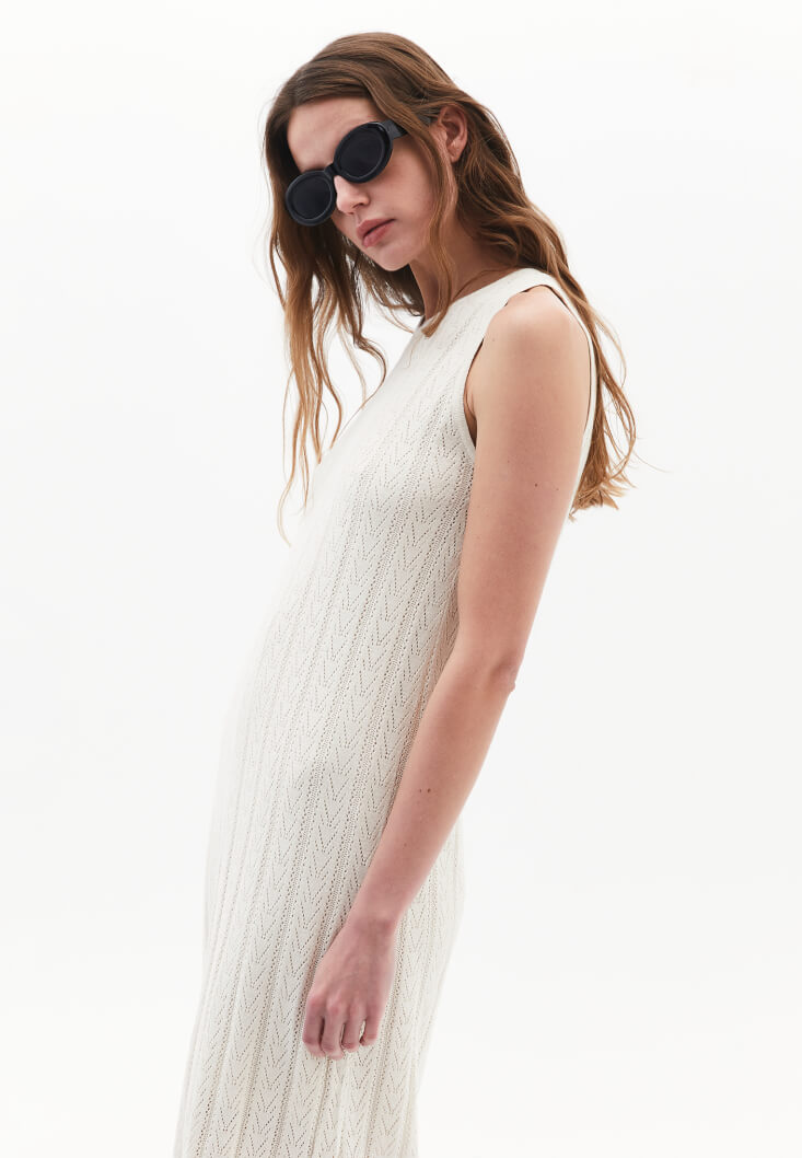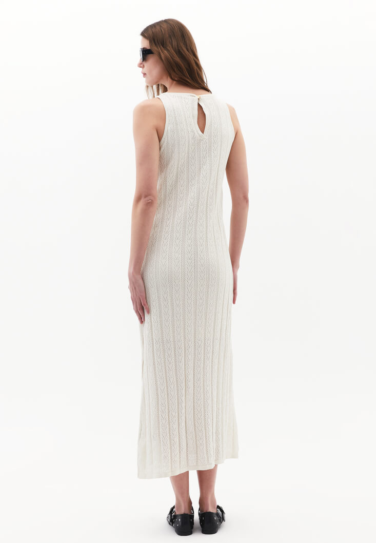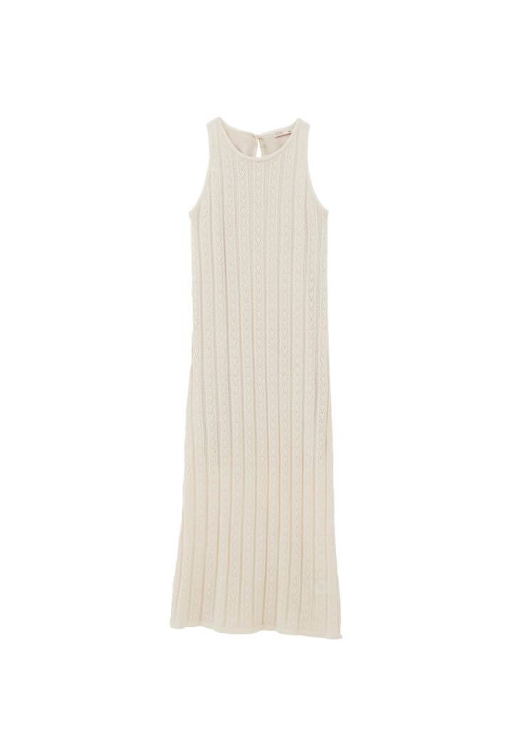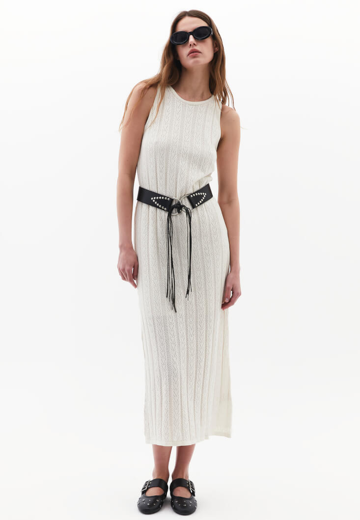 Ajurlu dokusu ve soft tonuyla öne çıkan bu uzun elbise, sade tasarımına rağmen güçlü bir etki yaratıyor. Vücuda oturan formu siluetinizi zarifçe vurgularken, uzun kesimi ve triko dokusu sayesinde yaz aylarında hem şıklık hem konfor sunuyor.
