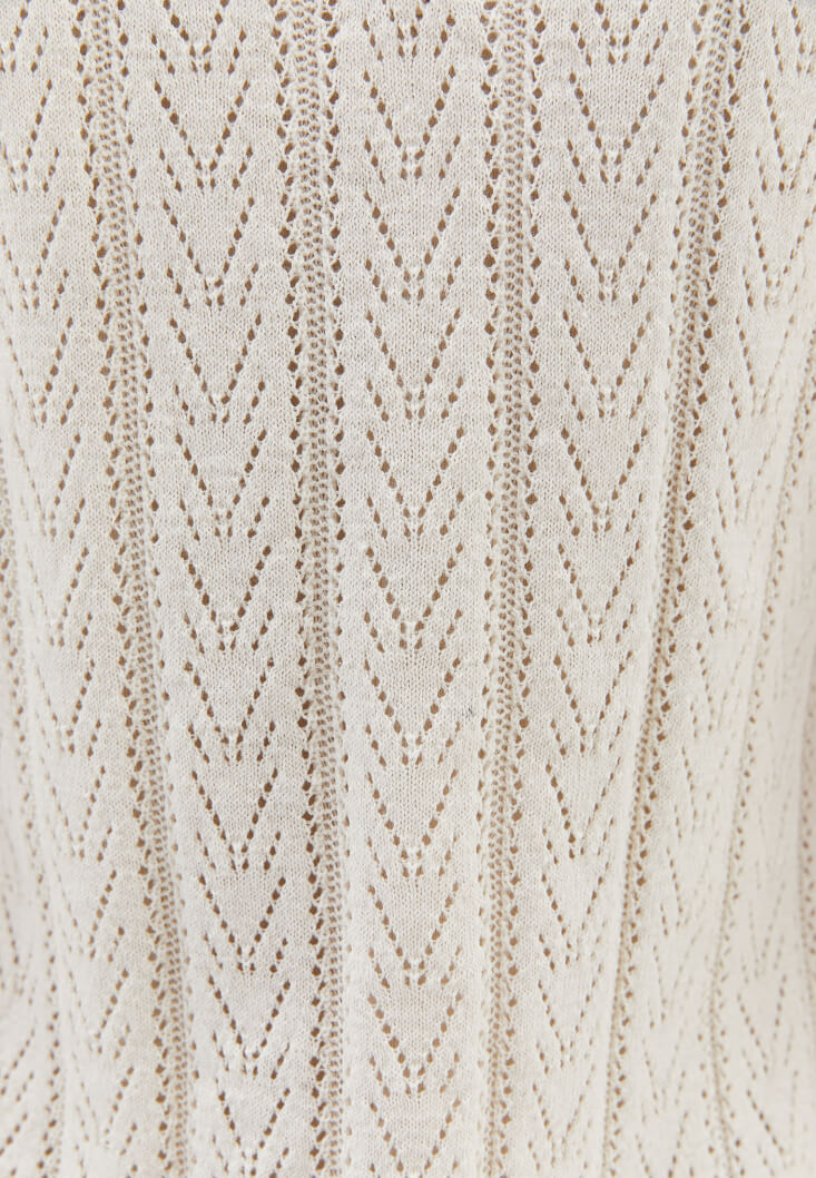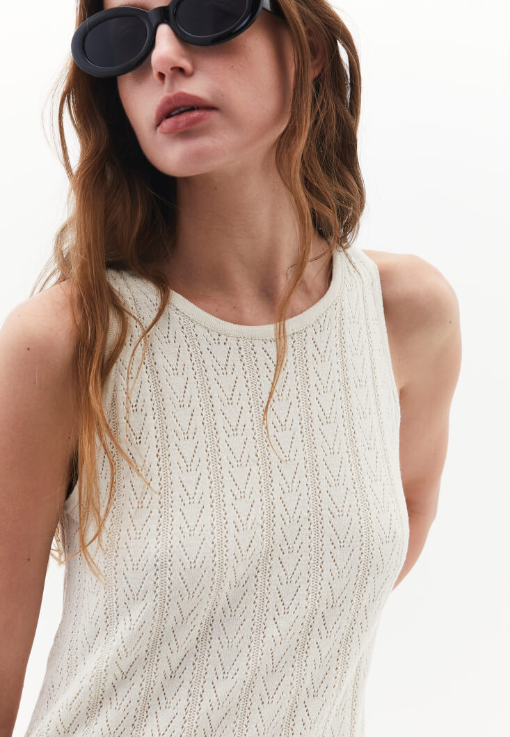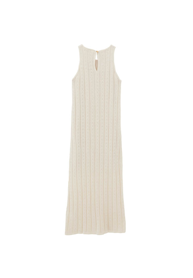 Bedene yakın loose fit, ajurlu örgü, uzun kesim, içi kısa astarlı, kolsuz tasarım, ense kısmı düğme kapamalı.