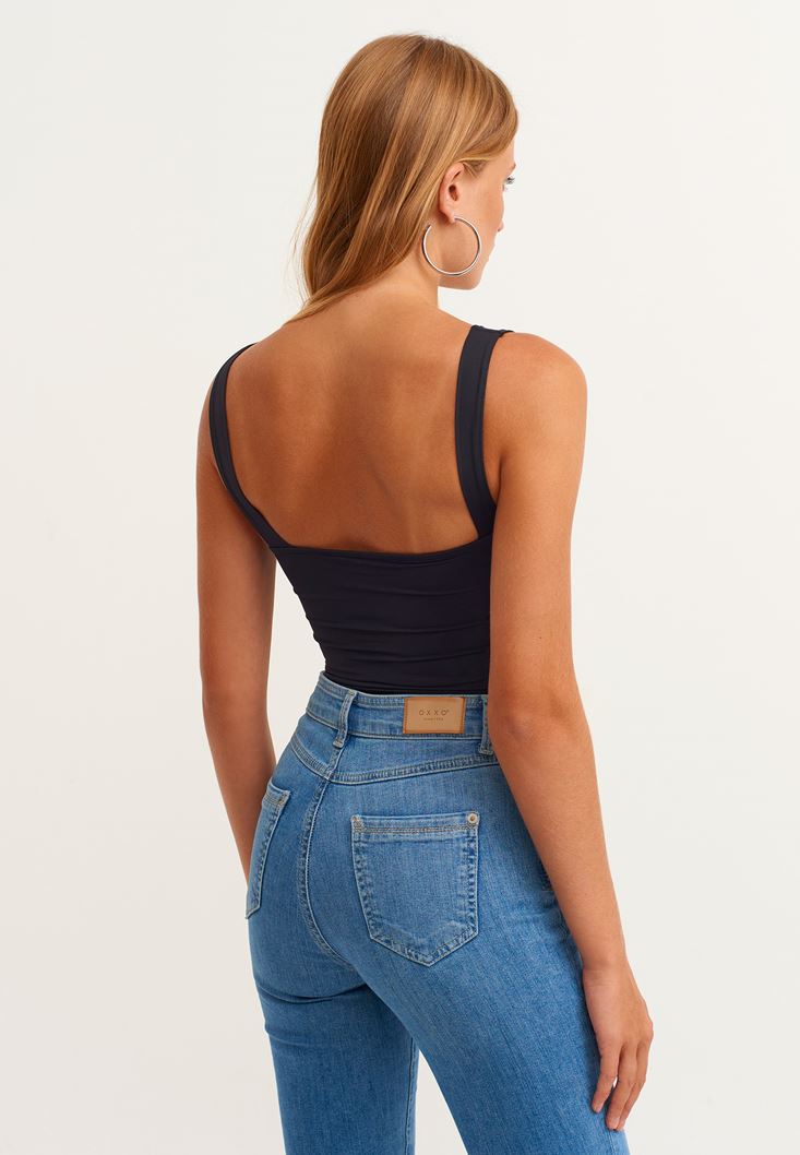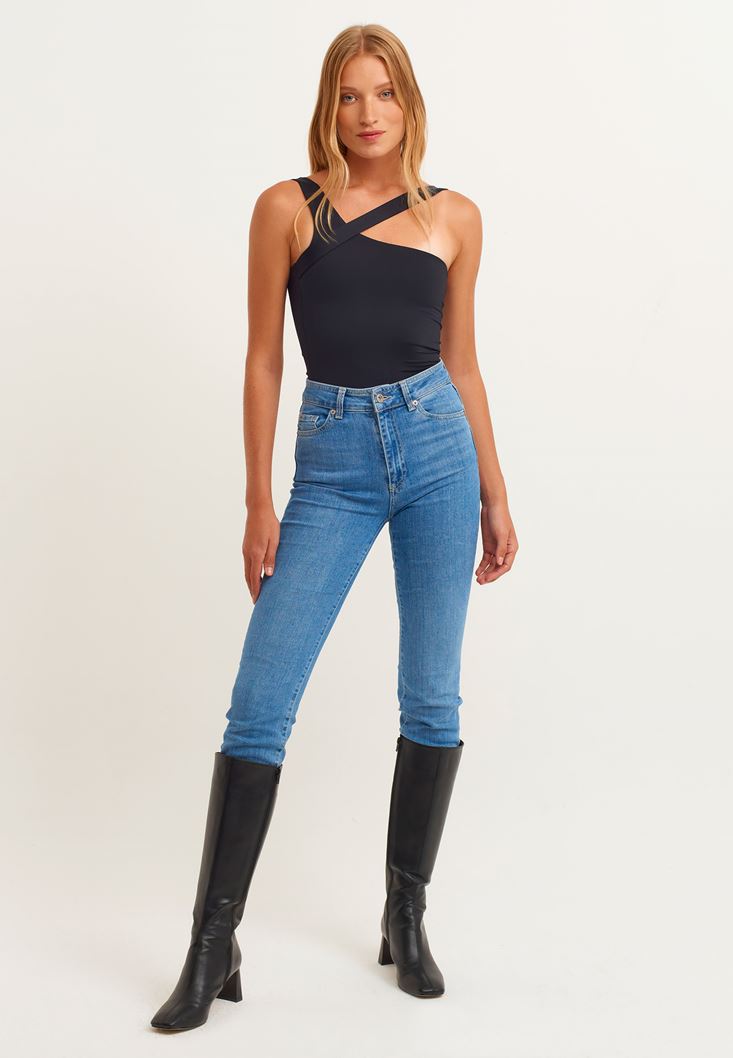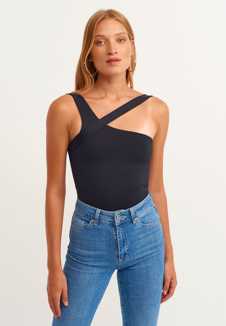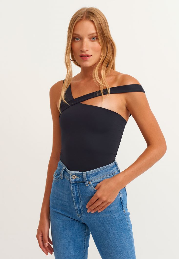 Özel yumuşak doku, asimetrik kalın askılı tasarım, bedeni saran rahat form, çıtçıt kapamalı.
