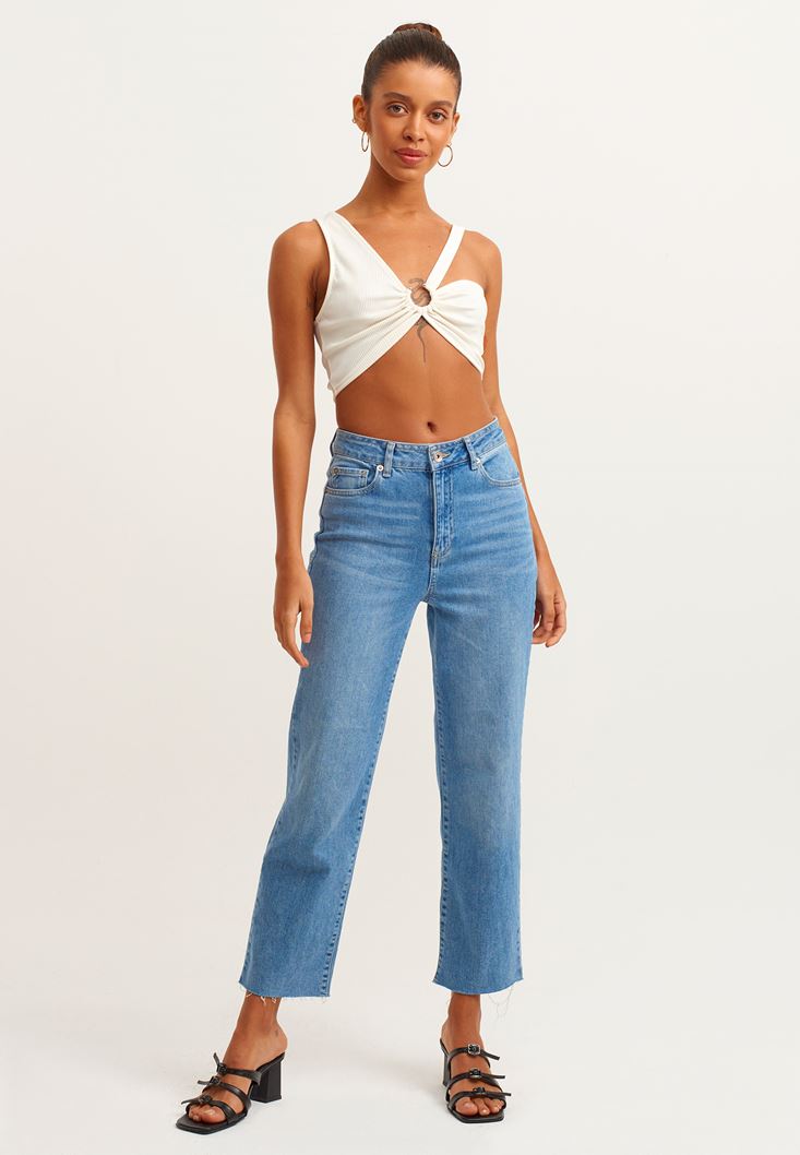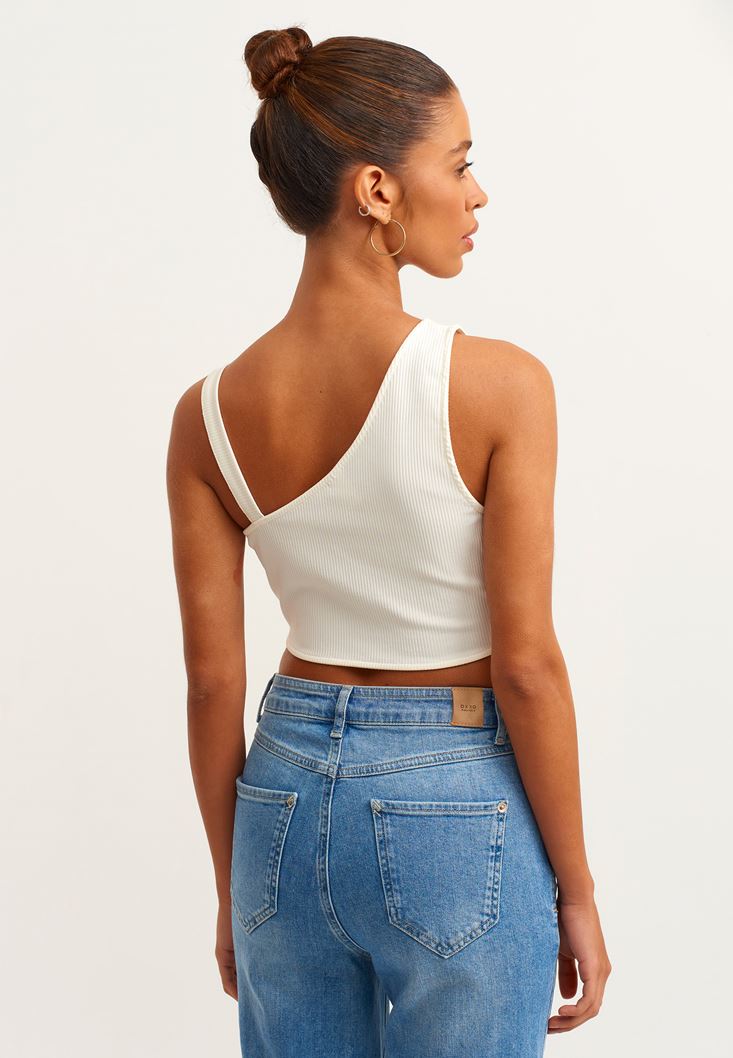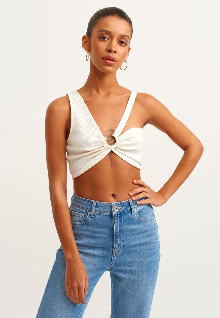 Esnek fitilli özel doku, asimetrik askılı, ön askı birleşiminde halka aksesuarlı, crop kesim, bedeni saran rahat kalıp.