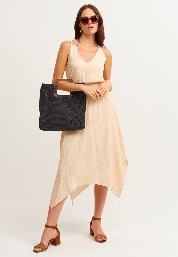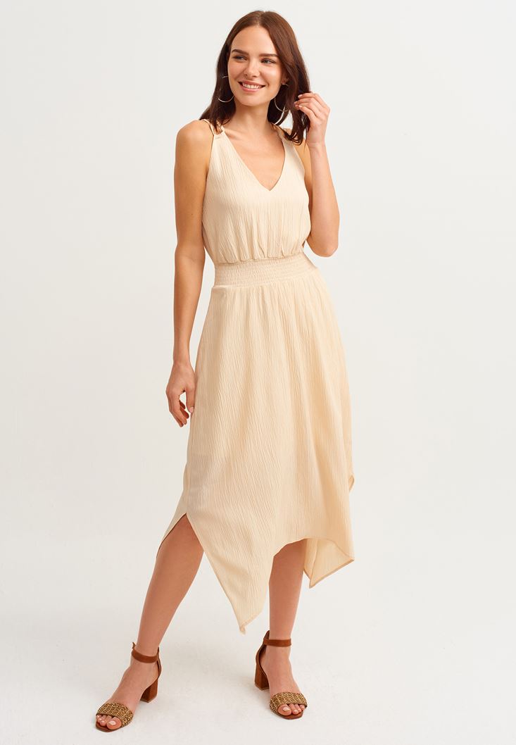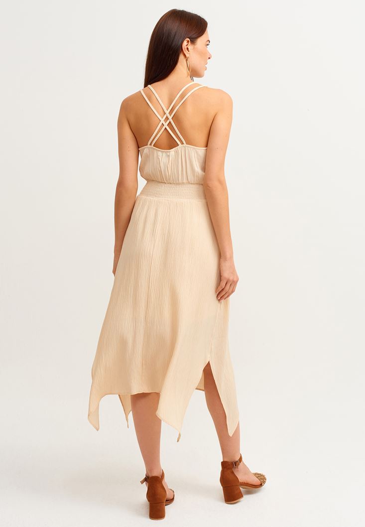 • Bayan Bej Asimetrik Detaylı Askılı Elbise