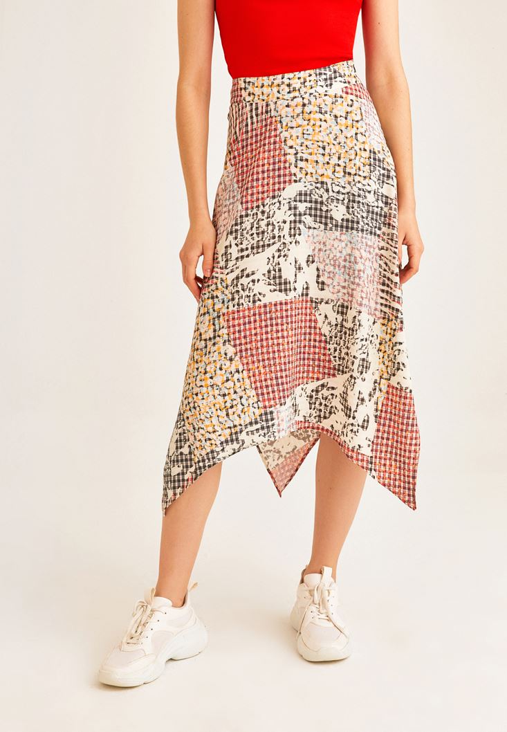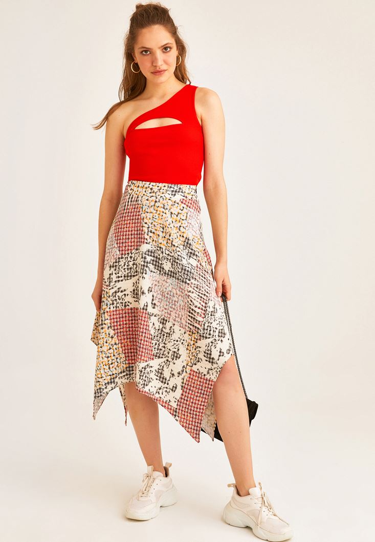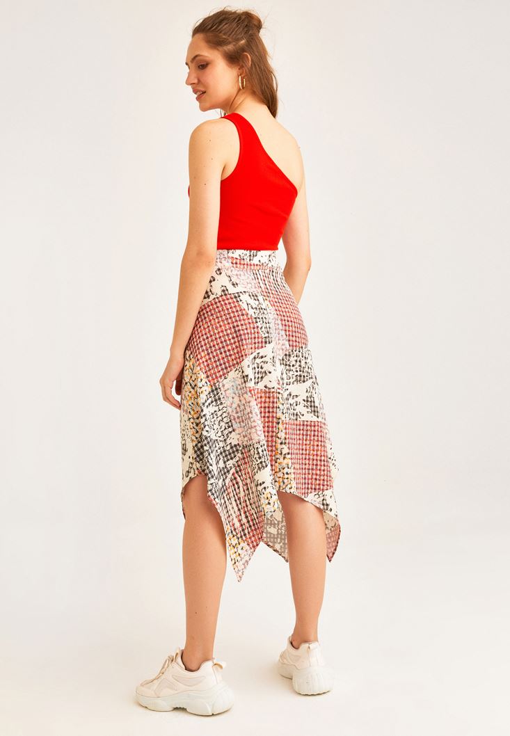 • Bayan Çok Renkli Asimetrik Detaylı Midi Etek