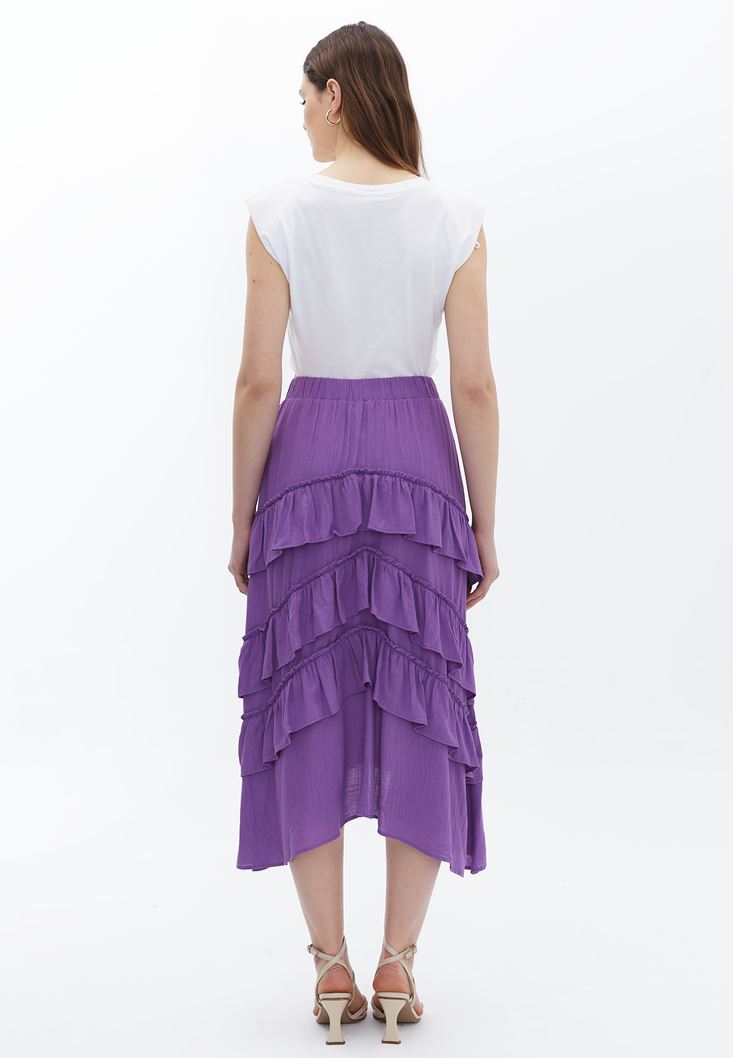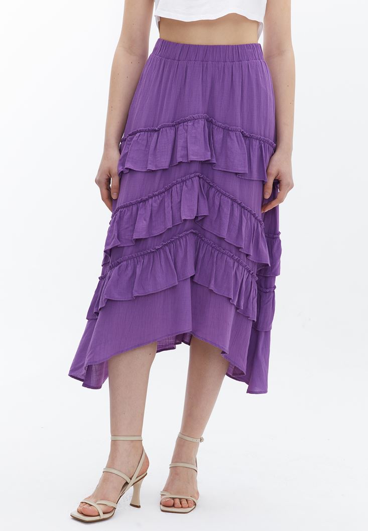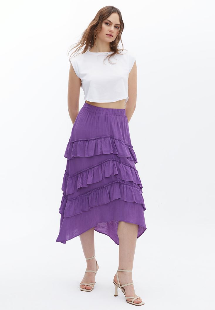 • Bayan Mor Asimetrik Kesim Fırfır Detaylı Etek