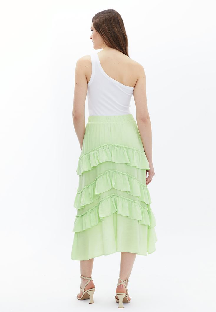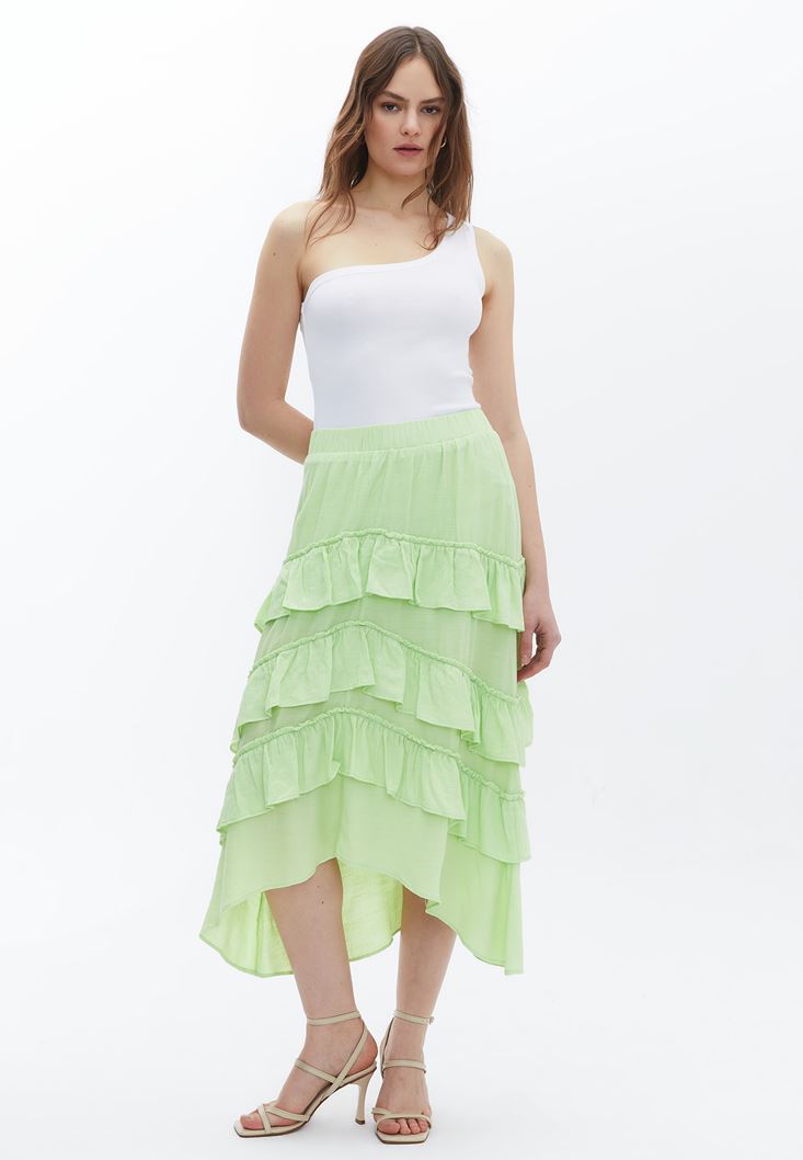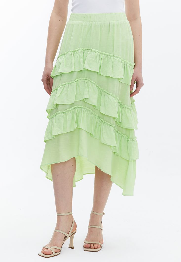 Yeşil Asimetrik Kesim Fırfır Detaylı Etek