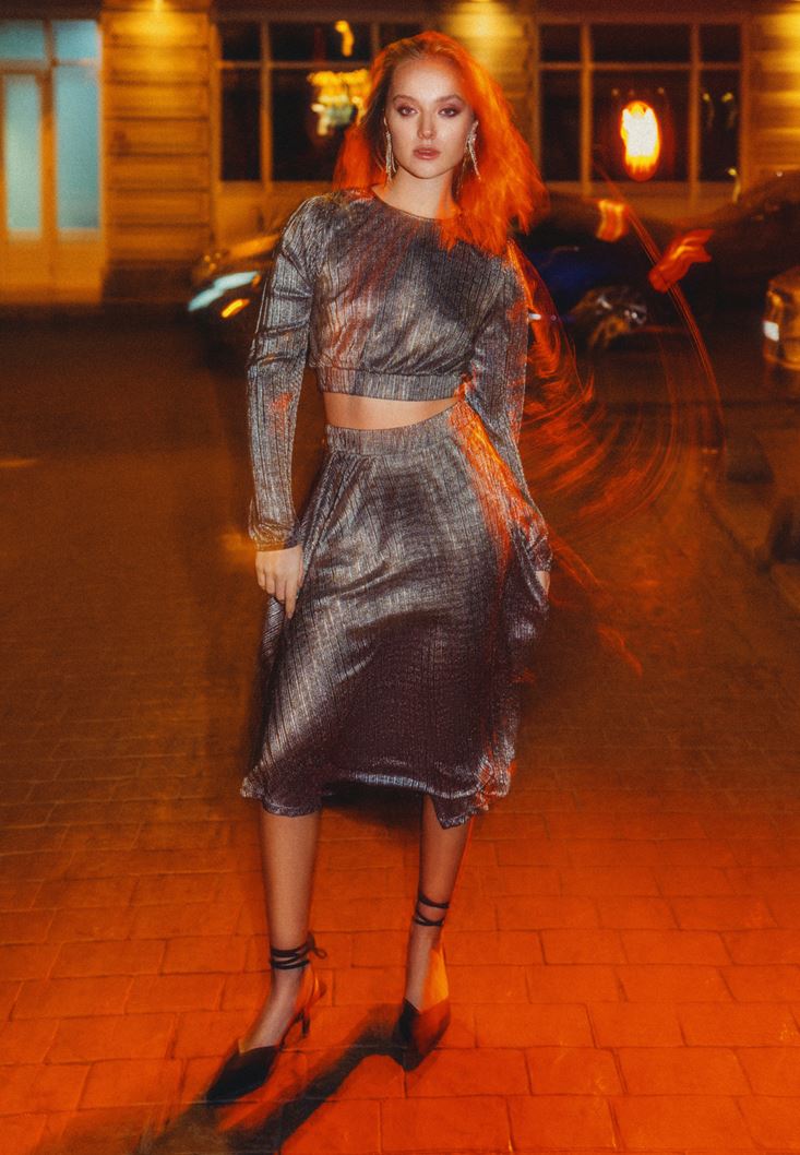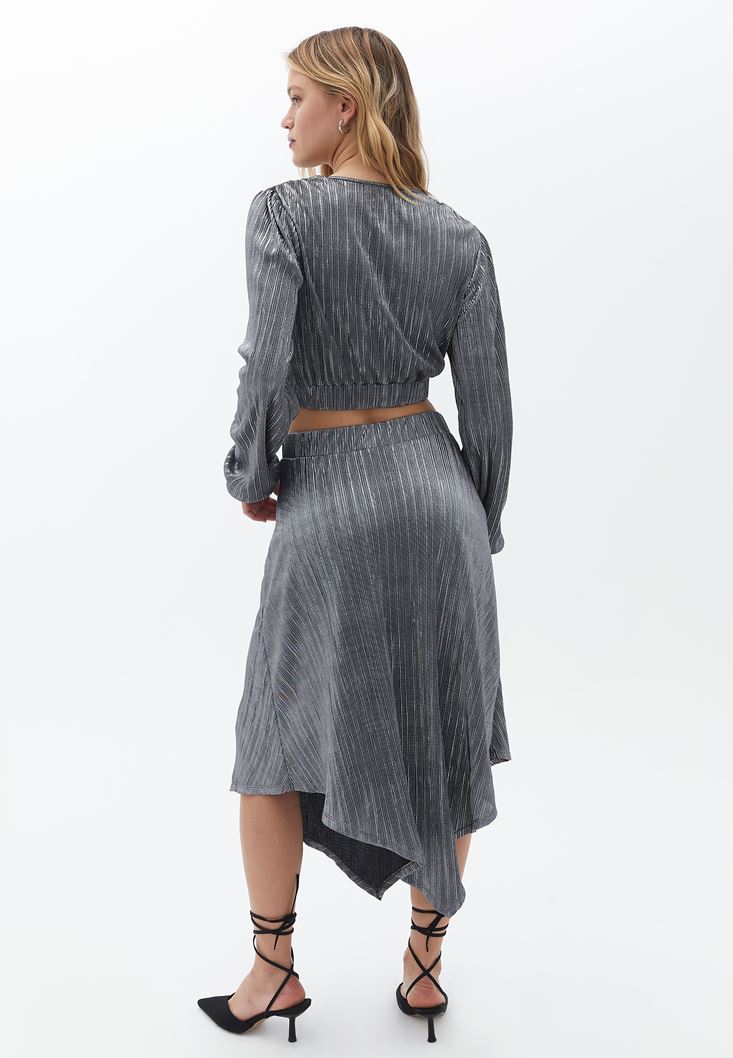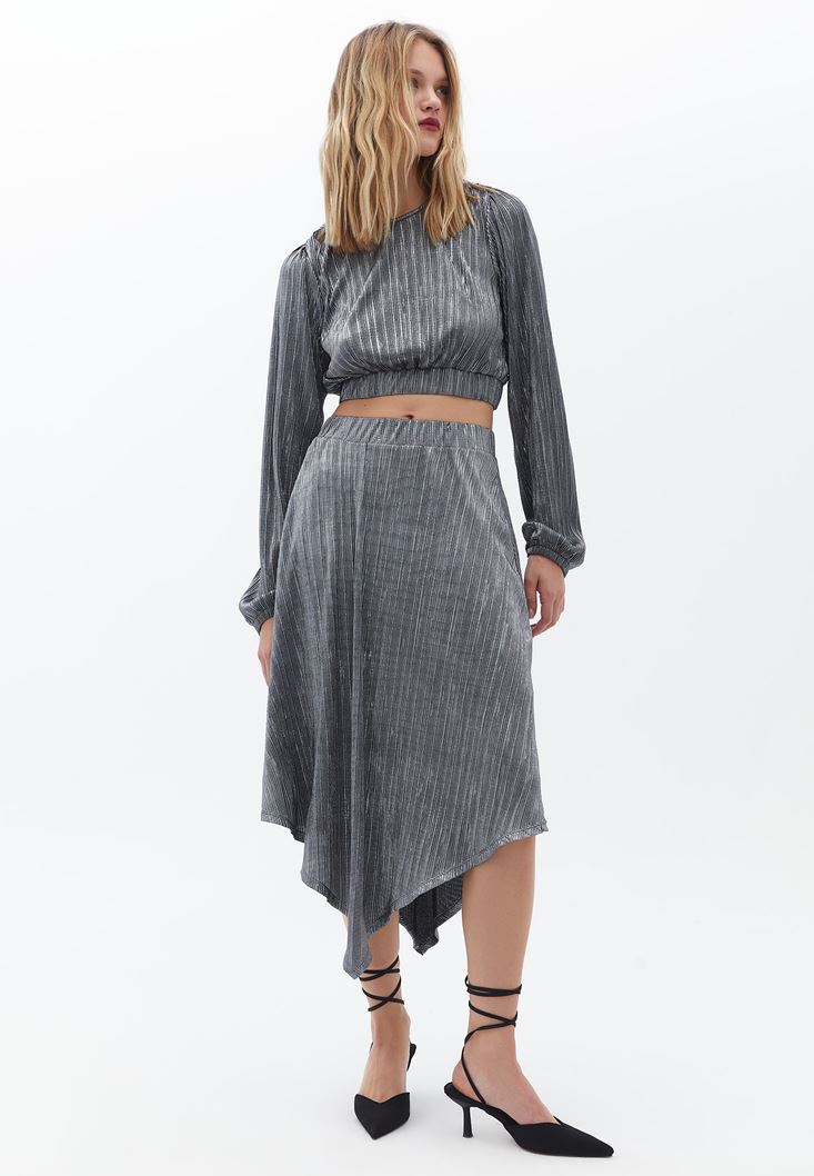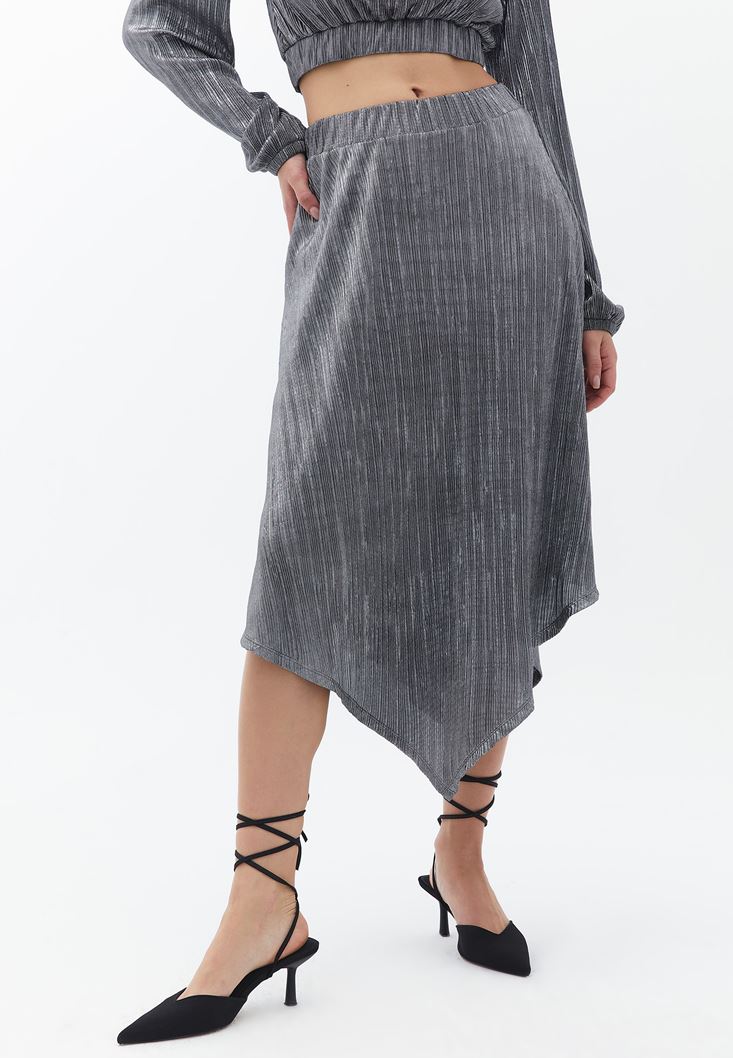 Özel pileli doku, yüksek bel, parlak görünümlü, beli lastikli, asimetrik midi boy, içi astarlı, a kesim.