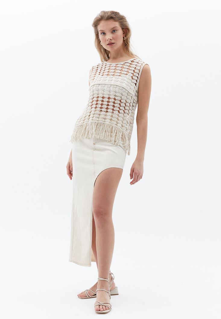 • Bayan Bej Asimetrik Kesim Uzun Etek