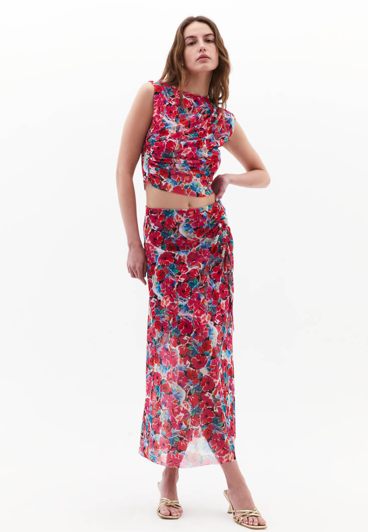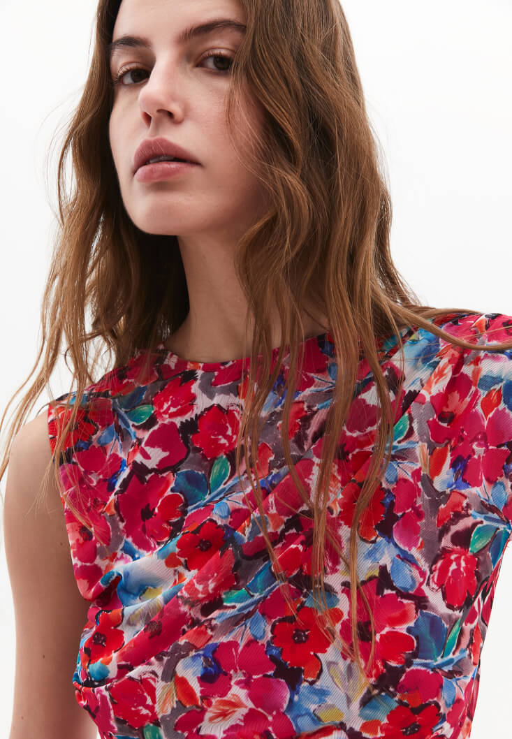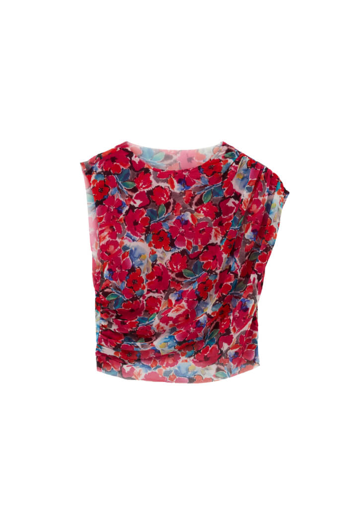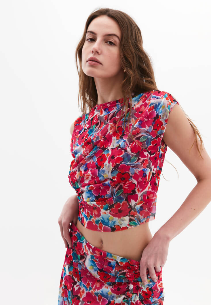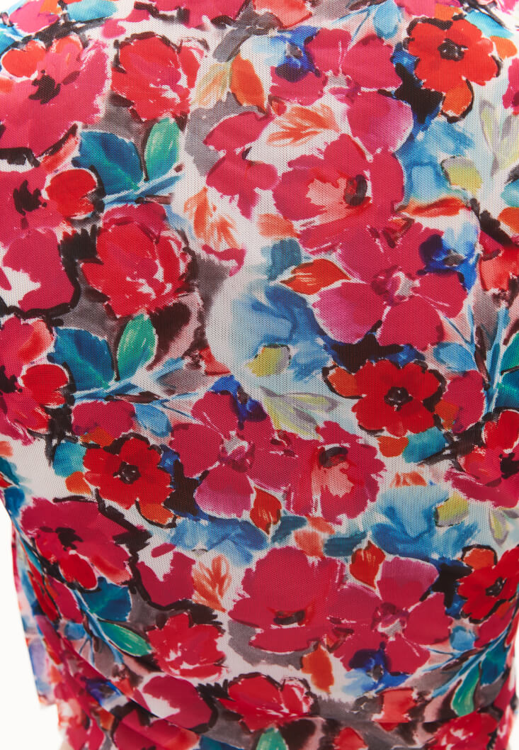 Bedene yakın fit, desenli tasarım, sıfır yaka, asimetrik kol detaylı, crop kesim, yan kısmı büzgülü, içi astarlı.