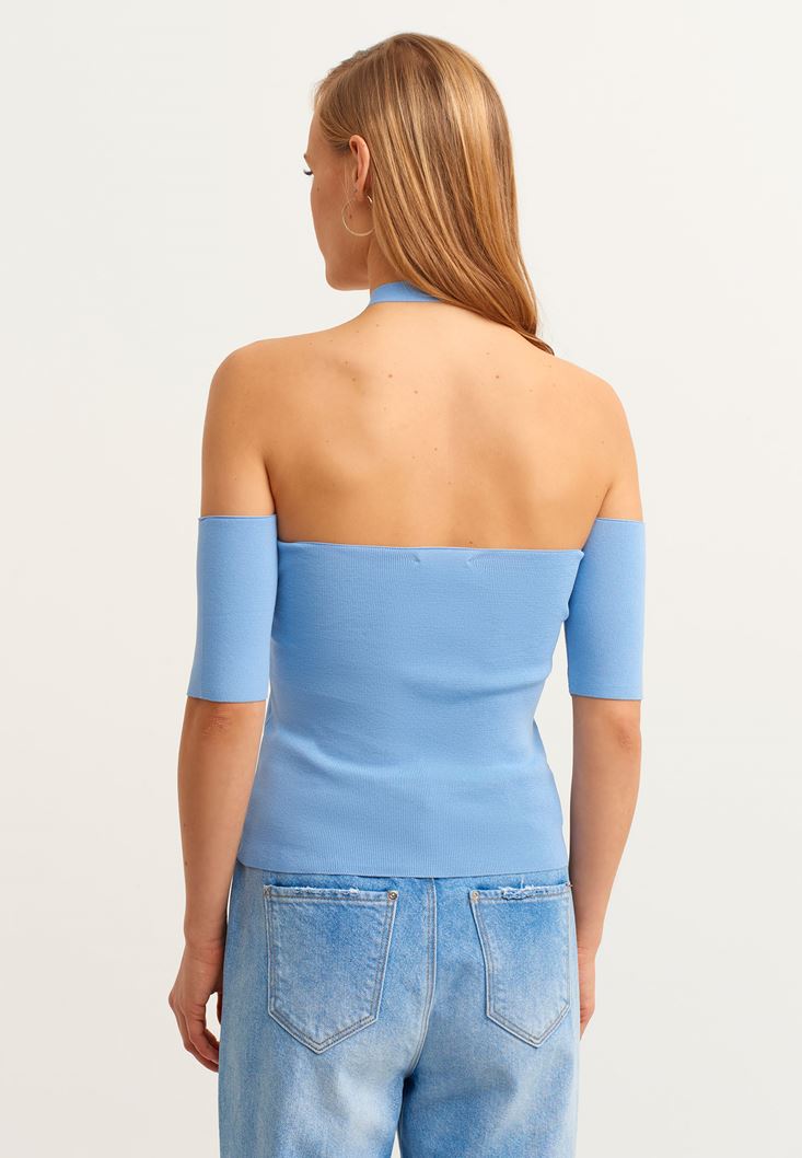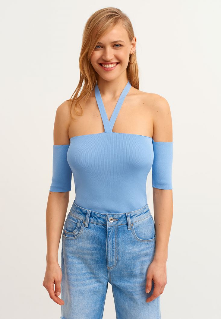 Viskon karışımlı özel triko doku, boyun askı detayı, düşük omuz duruşu, bedeni saran close-fit, crop kesim.