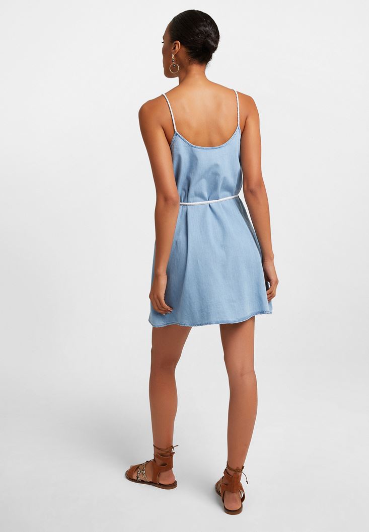 Mavi Askı Detaylı Mini Kot Elbise