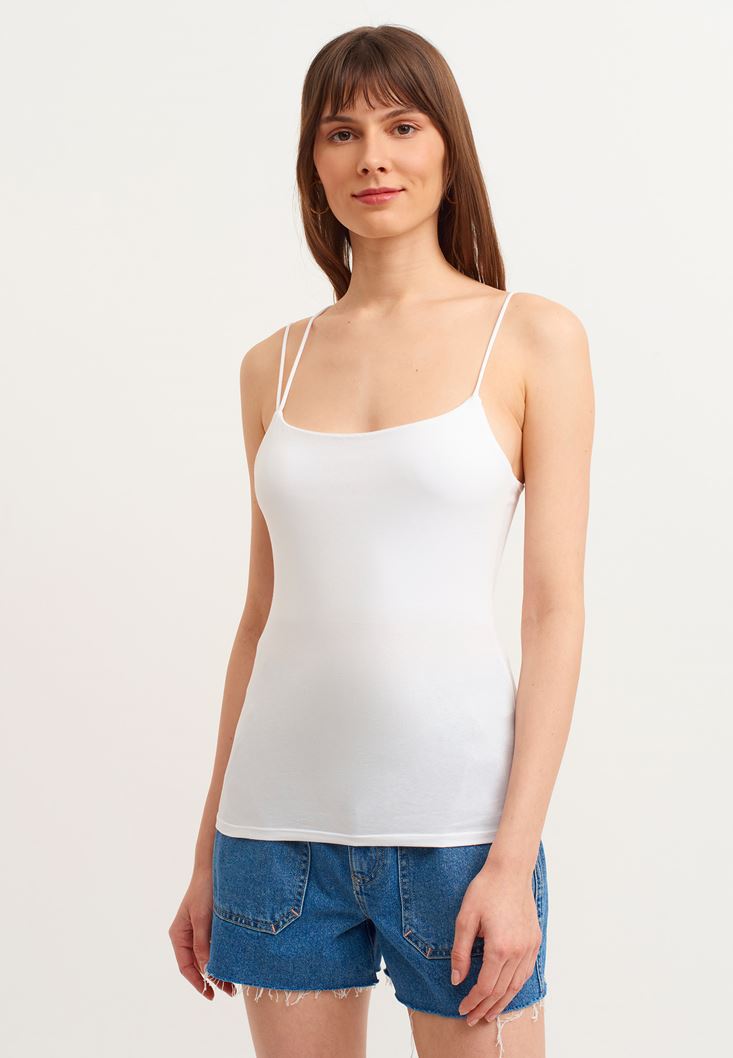 Yüksek pamuk karışımlı doku, önde veya arkada kullanılabilen çok yönlü askı, bedeni saran close-fit, ince askılı.