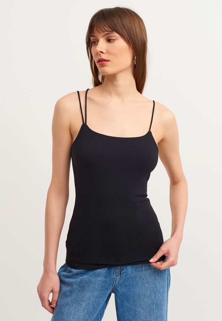 Yüksek pamuk karışımlı doku, önde veya arkada kullanılabilen çok yönlü askı, bedeni saran close-fit, ince askılı.