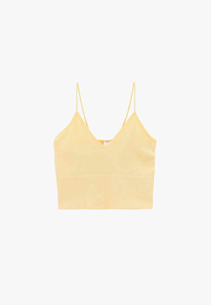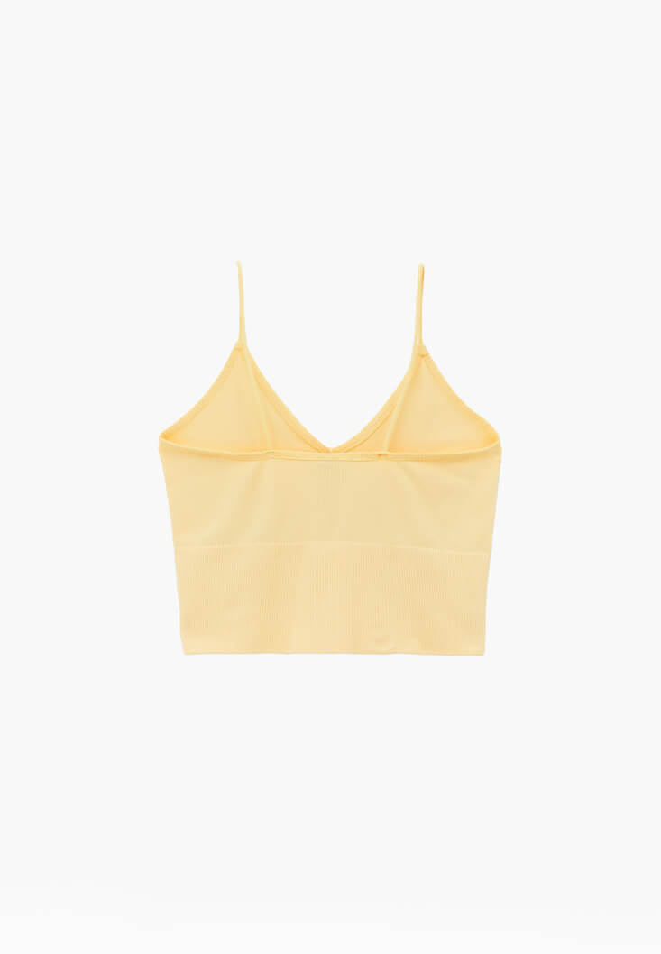 Bedeni saran ekstra esnek fit, V yaka, özel dikişsiz doku, ince askılı, crop kesim.