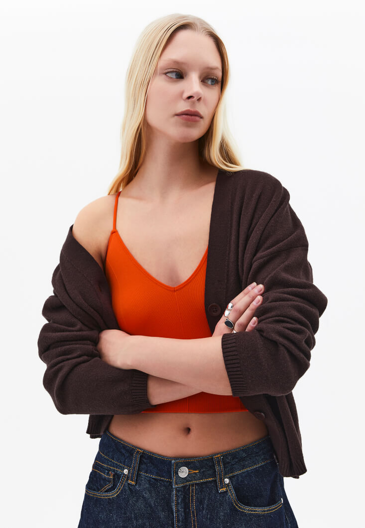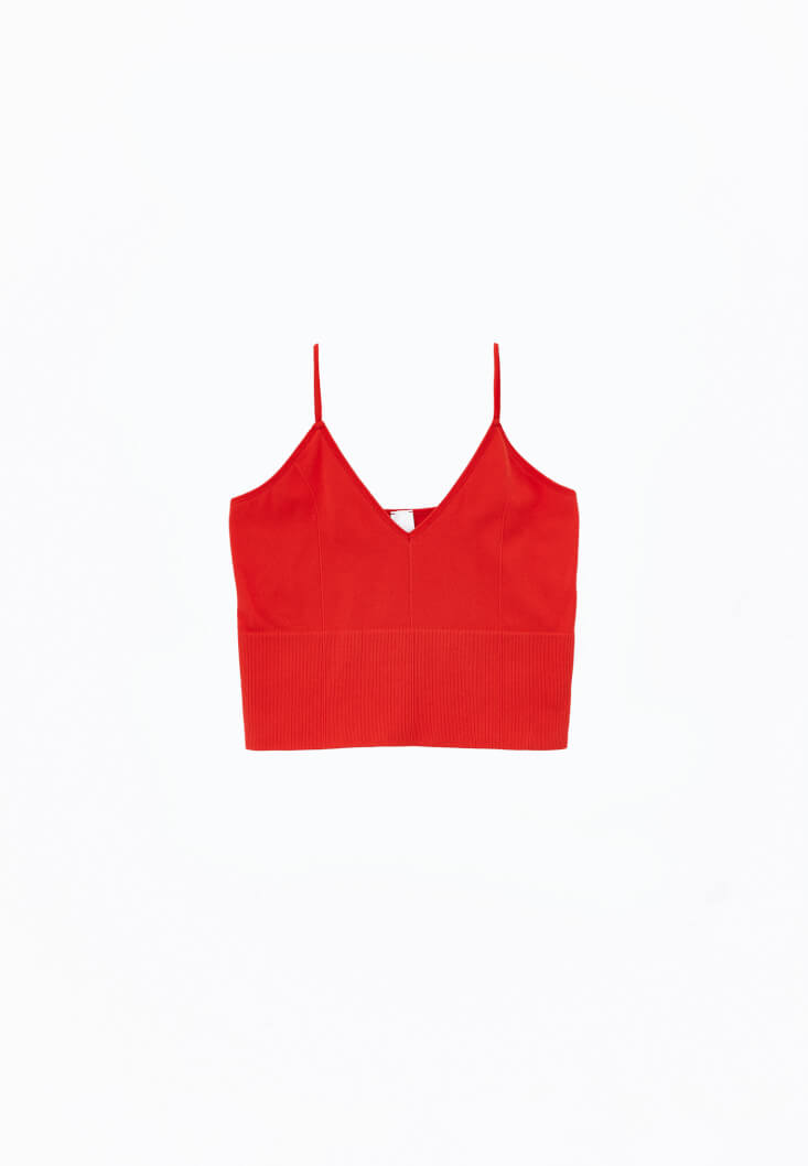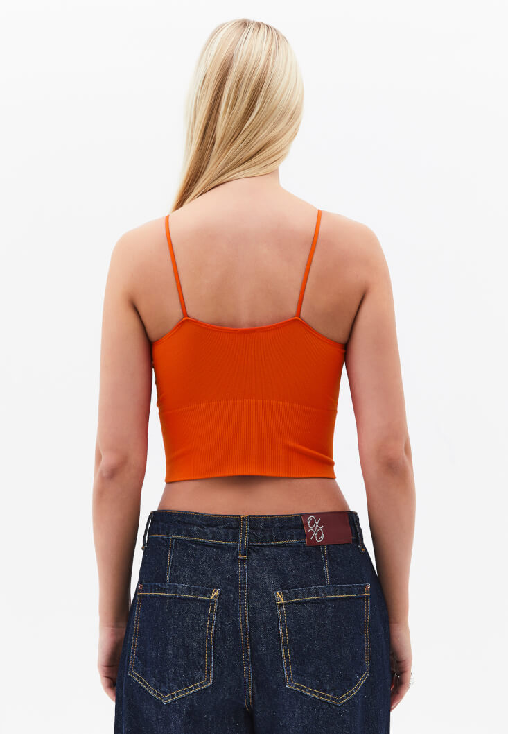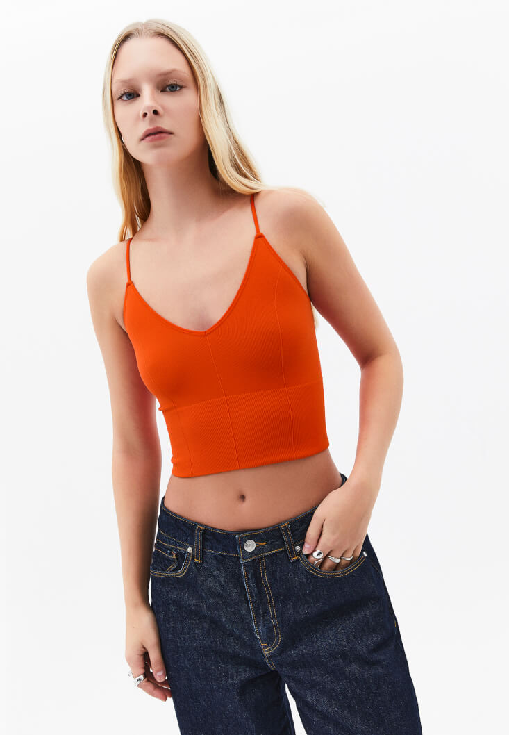 Bedeni saran ekstra esnek fit, V yaka, özel dikişsiz doku, ince askılı, crop kesim.