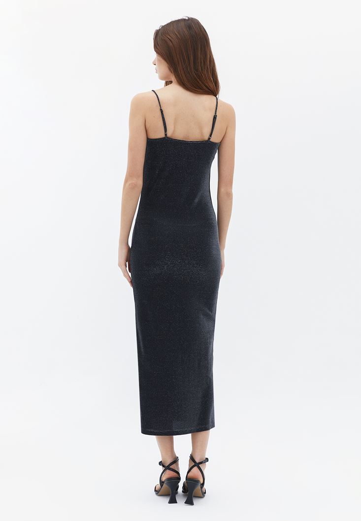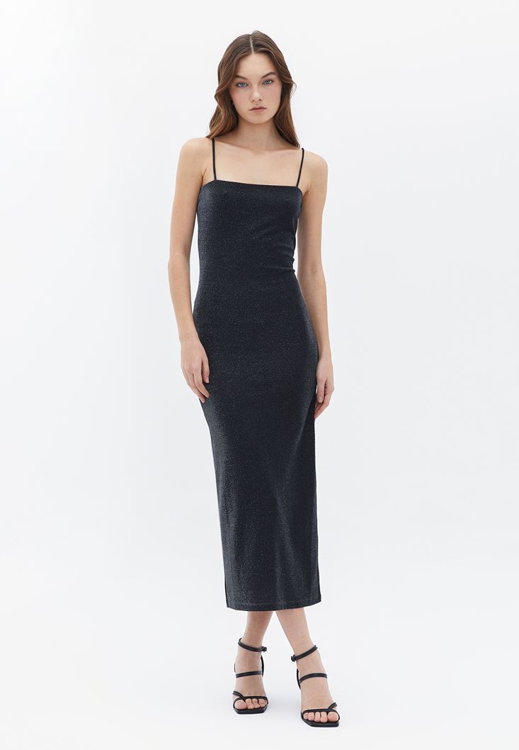 Bedeni saran esnek fit, kare yaka, ayarlanabilir ince askılı, midi boy, parıltı detaylı doku, içi astarlı.