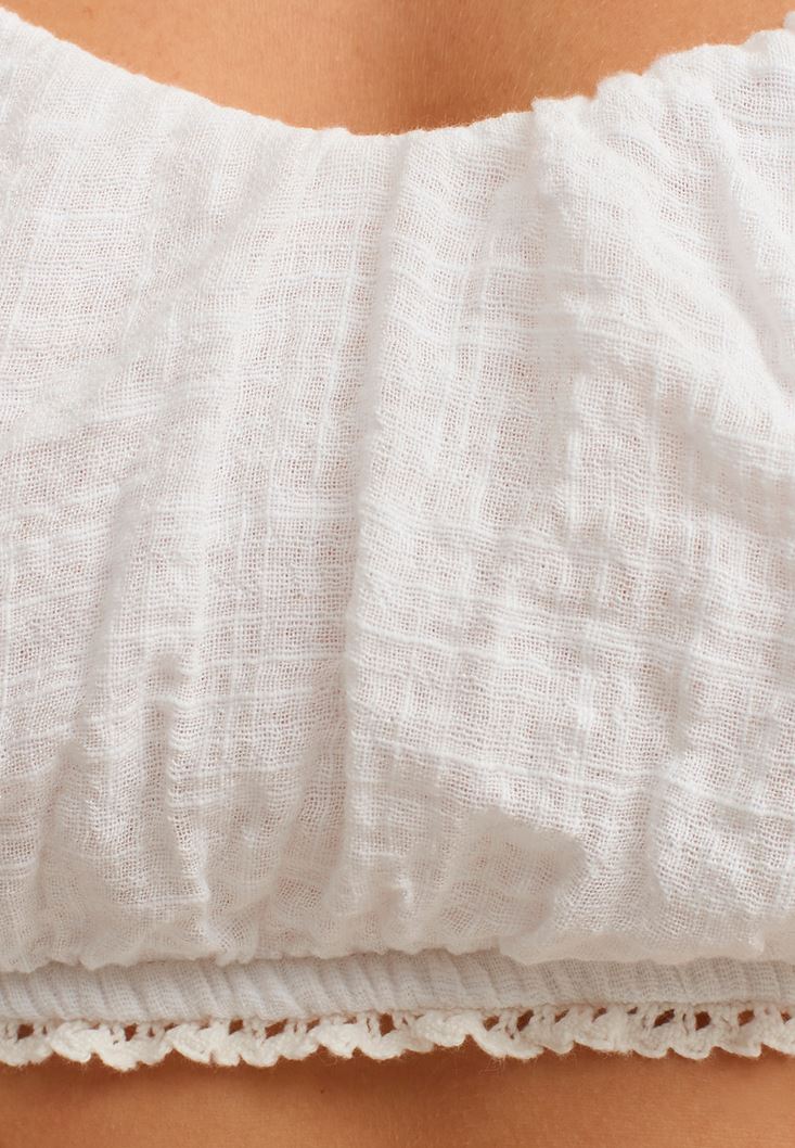 Pamuk ve viskon karışımlı doku, ince askılı, crop kesim, V yaka, etek ucu dantel detaylı, yaka duruşu büzgülü.