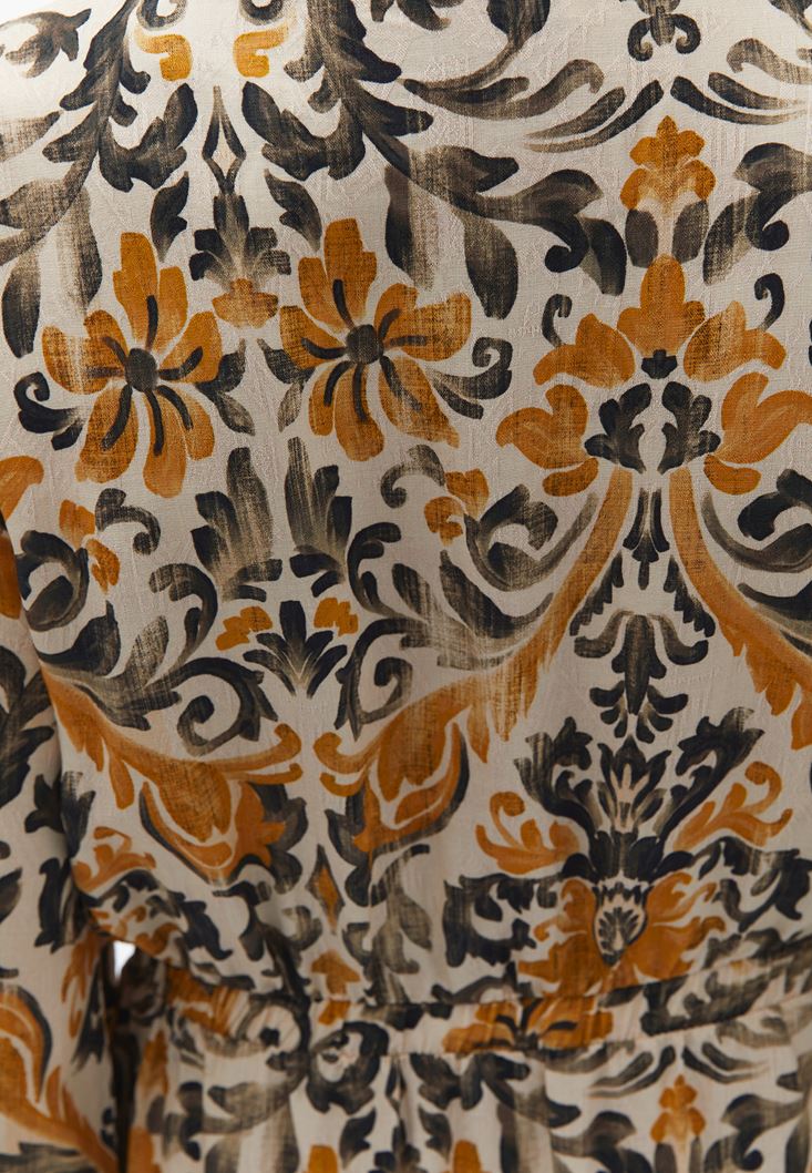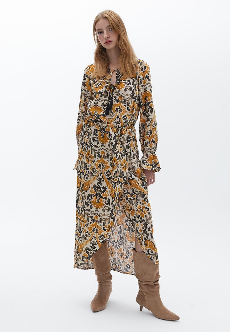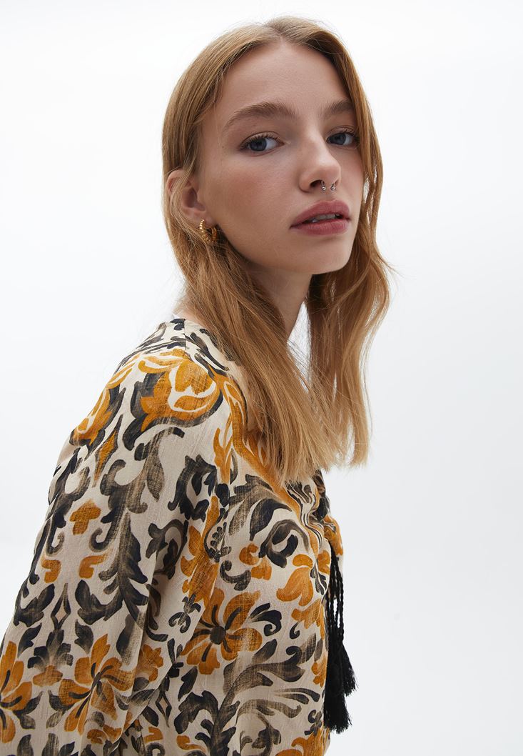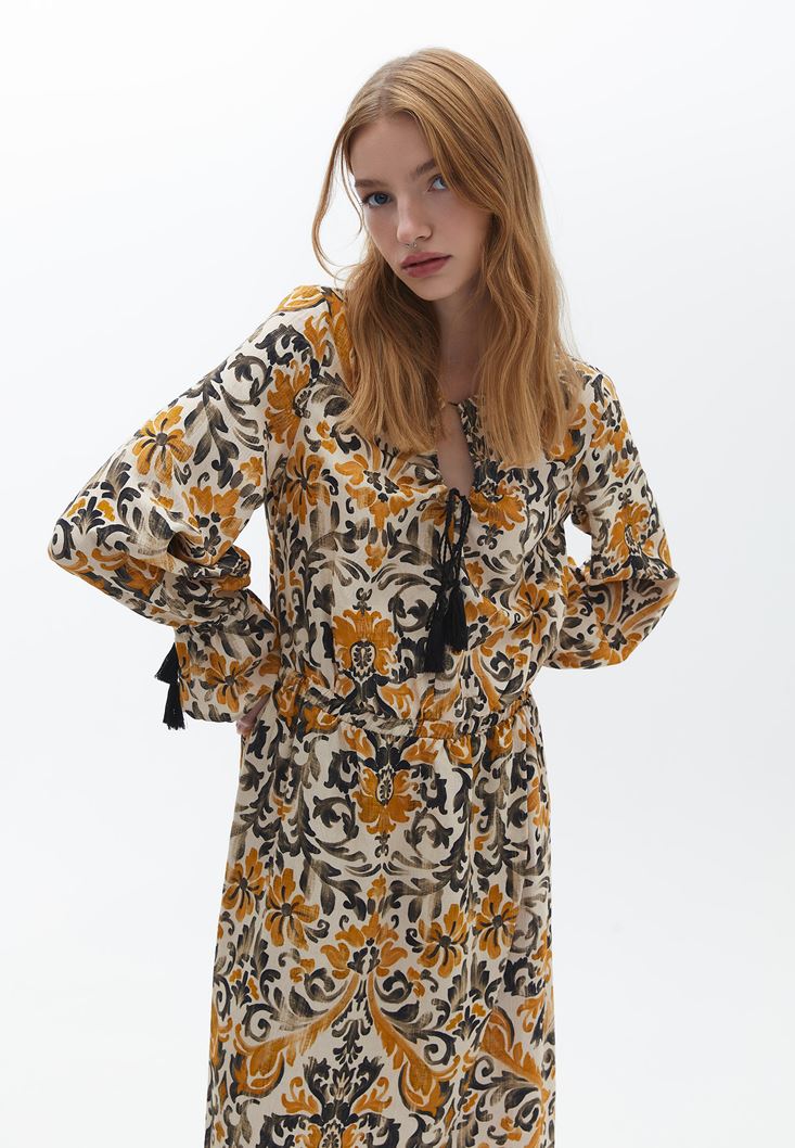 %100 viskon içerikli doku, etnik desenli, midi boy, uzun kollu, kruvaze kapamalı etek, yakası ve kol ucu bağcıklı.