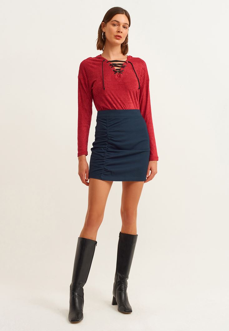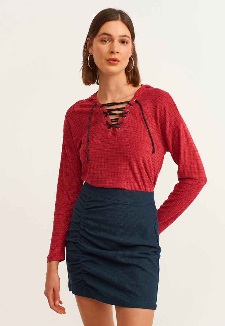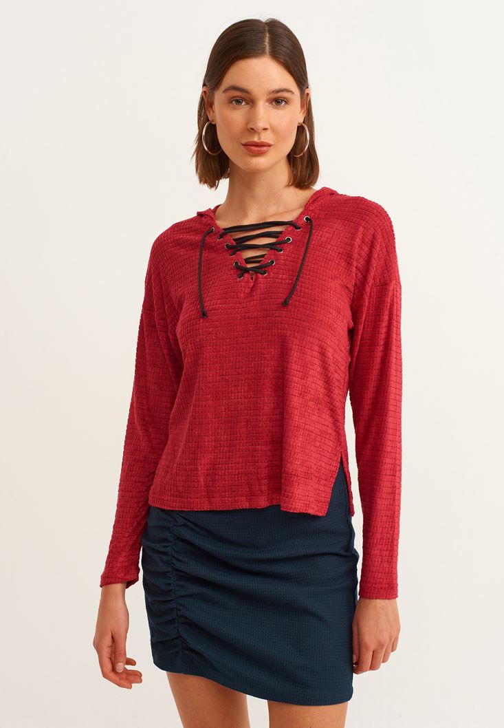 Bordo Bağcık Detaylı Kapüşonlu Bluz