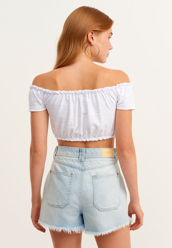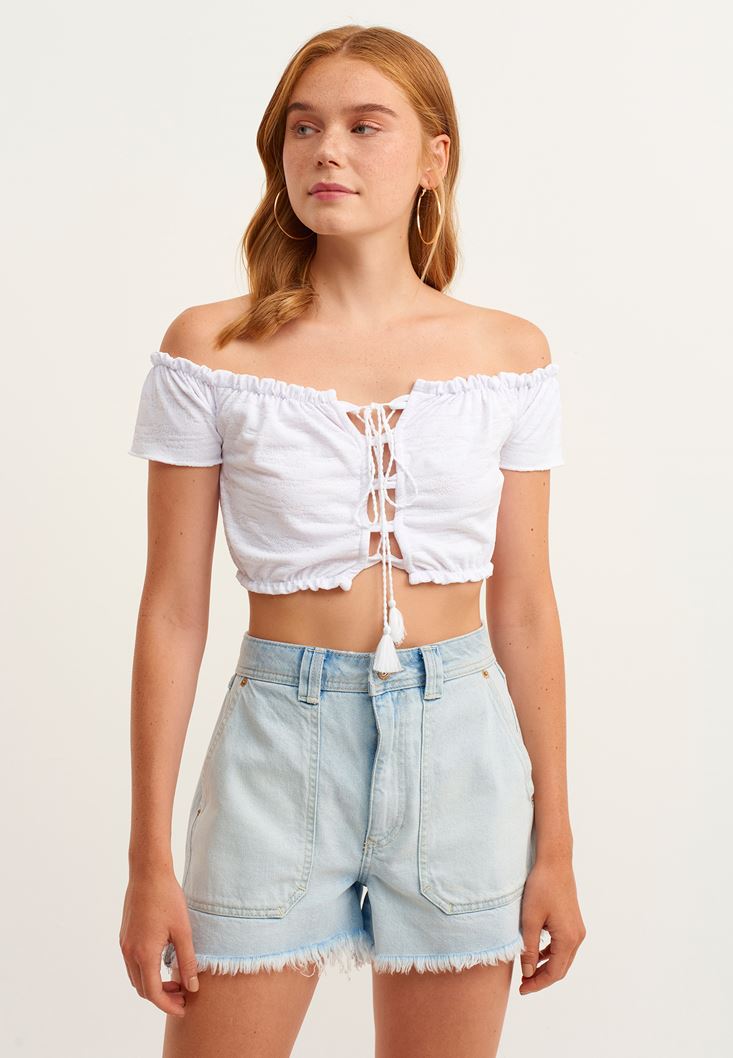 Düşük omuz tasarım, ön kısmı bağcık detaylı, bel ve omuz kısmı lastikli, crop kesim.