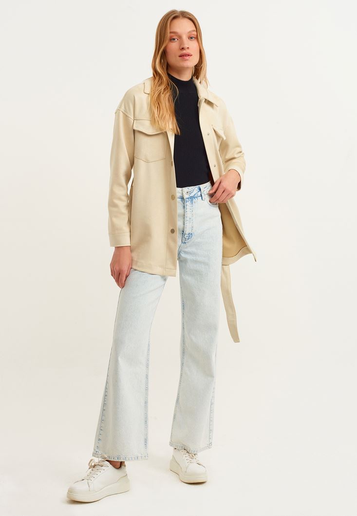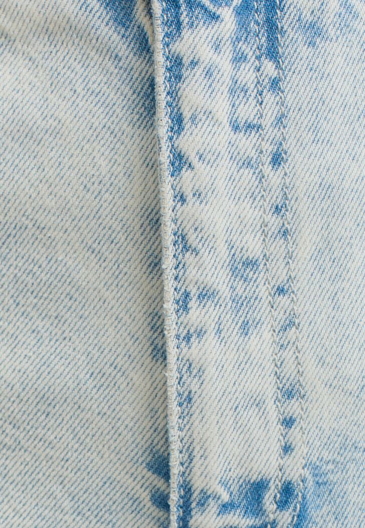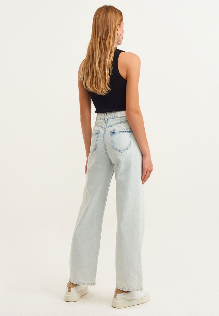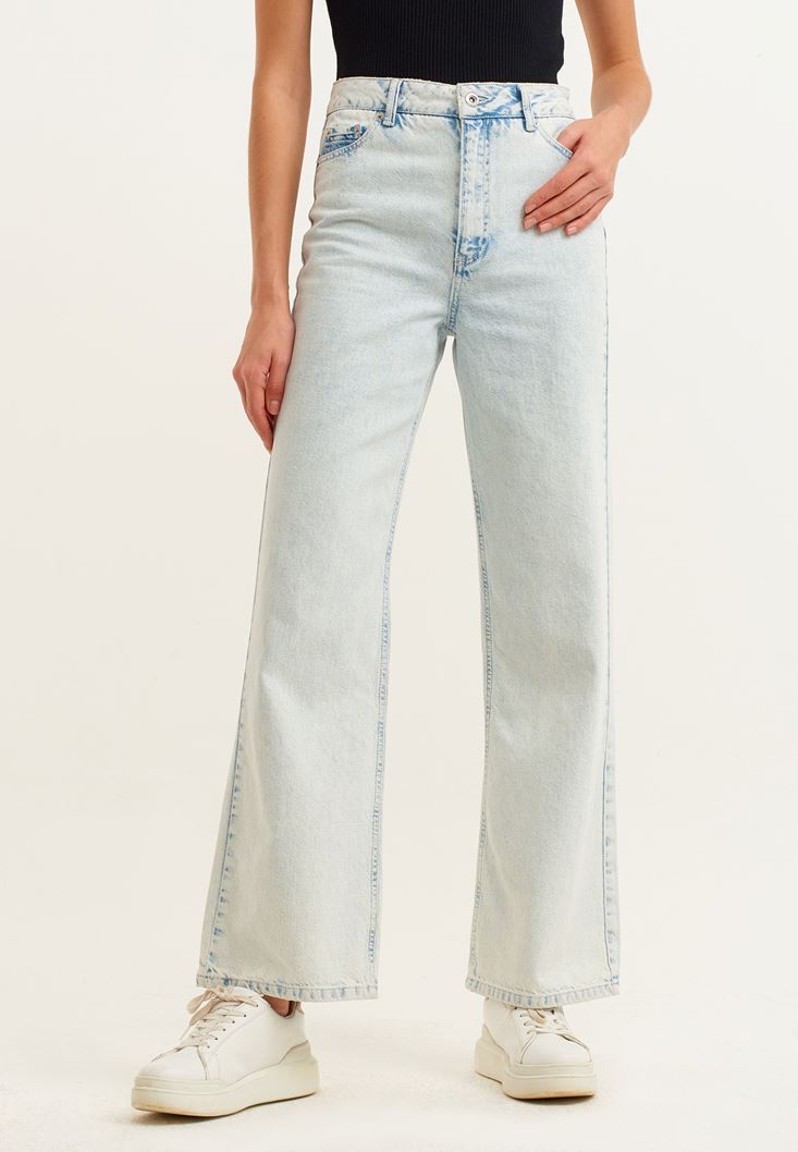%100 pamuklu denim doku, yüksek bel, geniş paça detaylı, bedene yakın baggy-fit, önü ve arkası iki cepli.