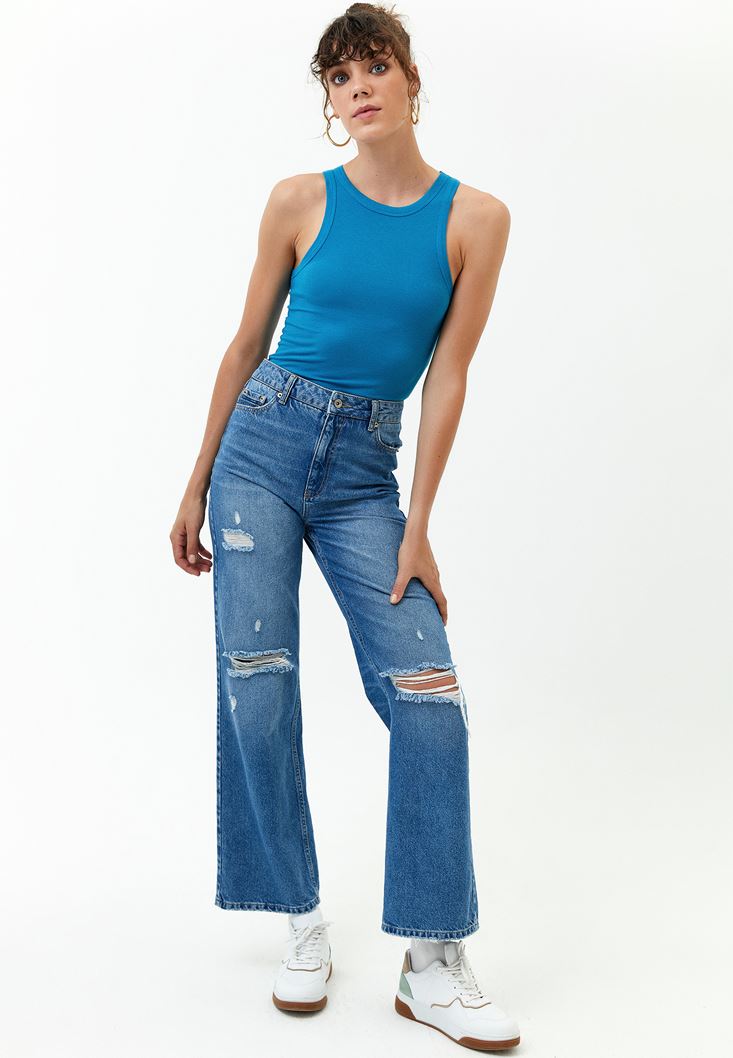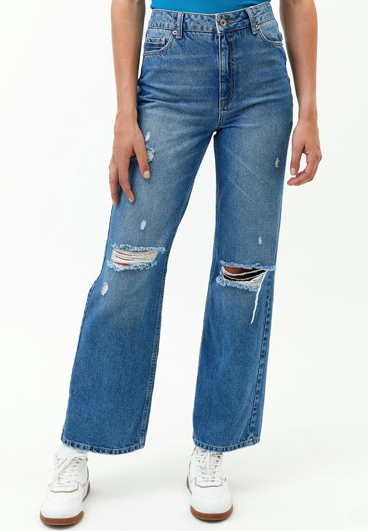 %100 pamuklu denim doku, yüksek bel, geniş paça detaylı, bedene yakın baggy-fit, önü ve arkası iki cepli.