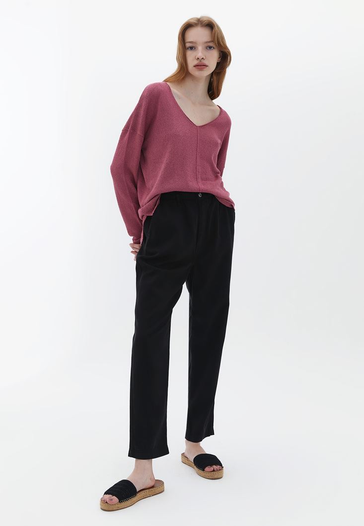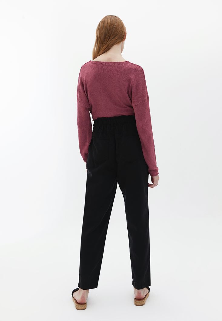 Tencel(Lyocell) ve pamuk karışımlı geri dönüştürülebilir doku, ultra yüksek bel, nefes alabilen kumaş, önü ve arkası iki cepli, bedenden uzak baggy fit, havuç kesim paça, beli lastikli.