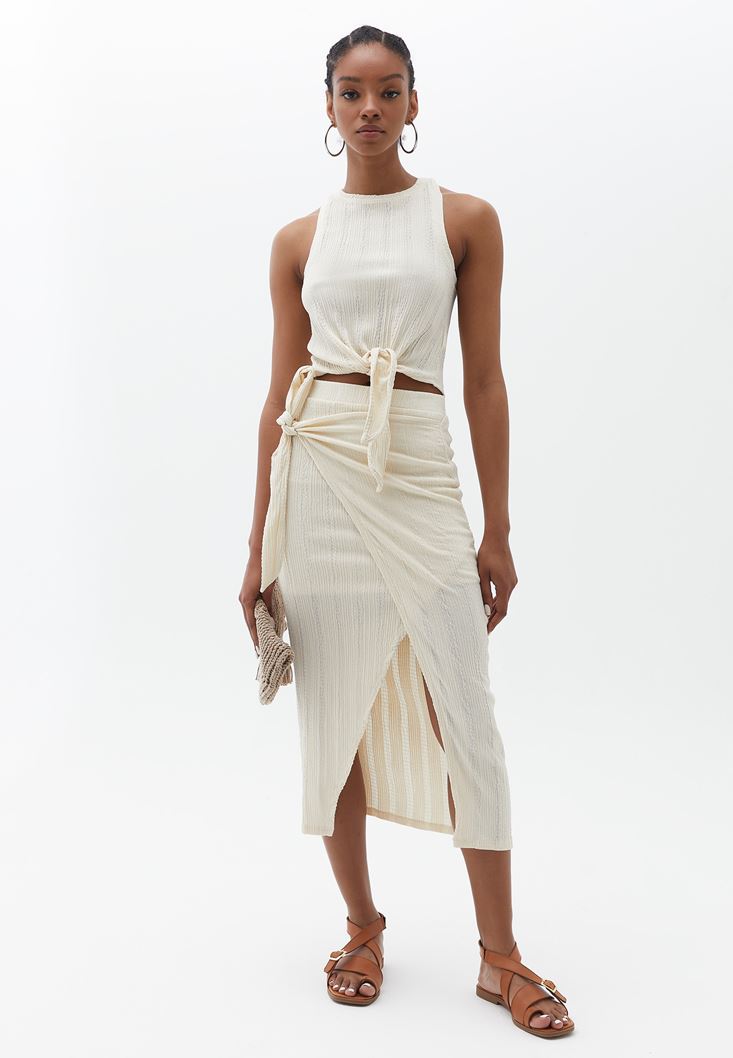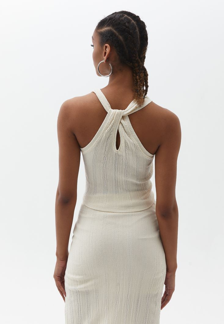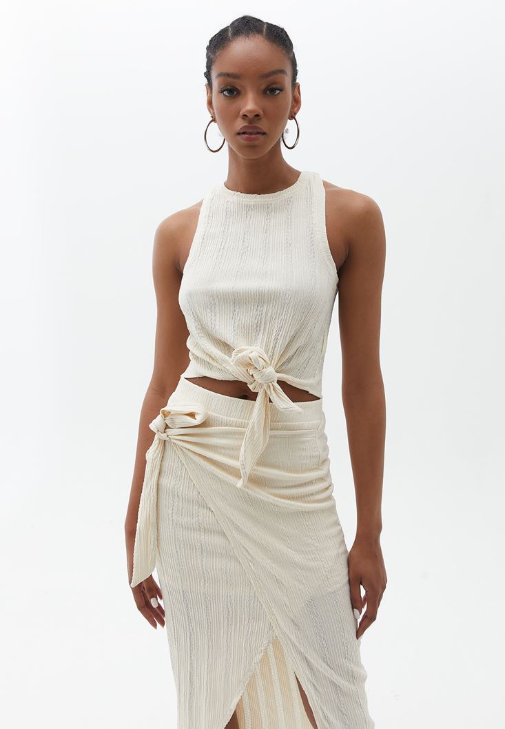 Dokulu özel kumaş, crop kesim, sıfır yaka, beli bağlama detaylı, sırt kısmı askı geçişli, bedeni saran fit.