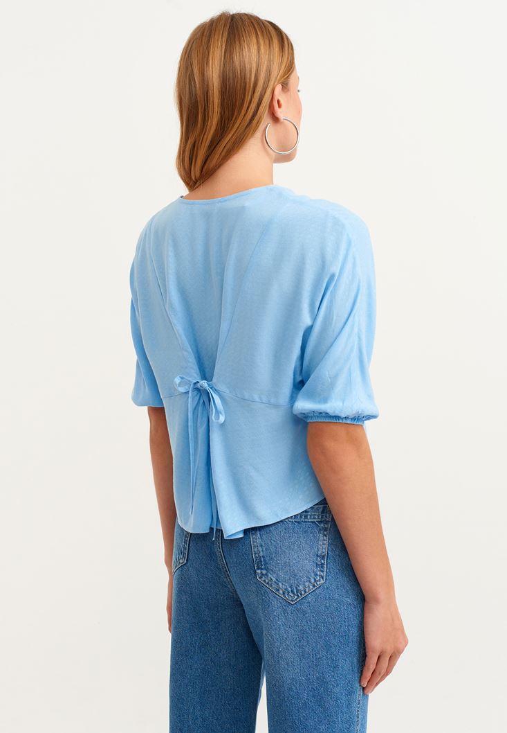 %100 viskon içerikli, yakası bağcıklı, bel kısmı volanlı, kol ucu lastikli, yarım kollu, V yaka, sırtı bağcık detaylı.