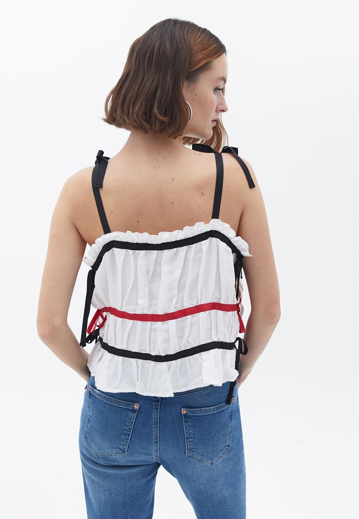 %100 viskon içerikli doğal doku, kare yaka, bedene yakın fit, yan kısımları bağcık detaylı, beden boyunca büzgülü ve biyeli tasarım, bağlanabilir ince askılı.